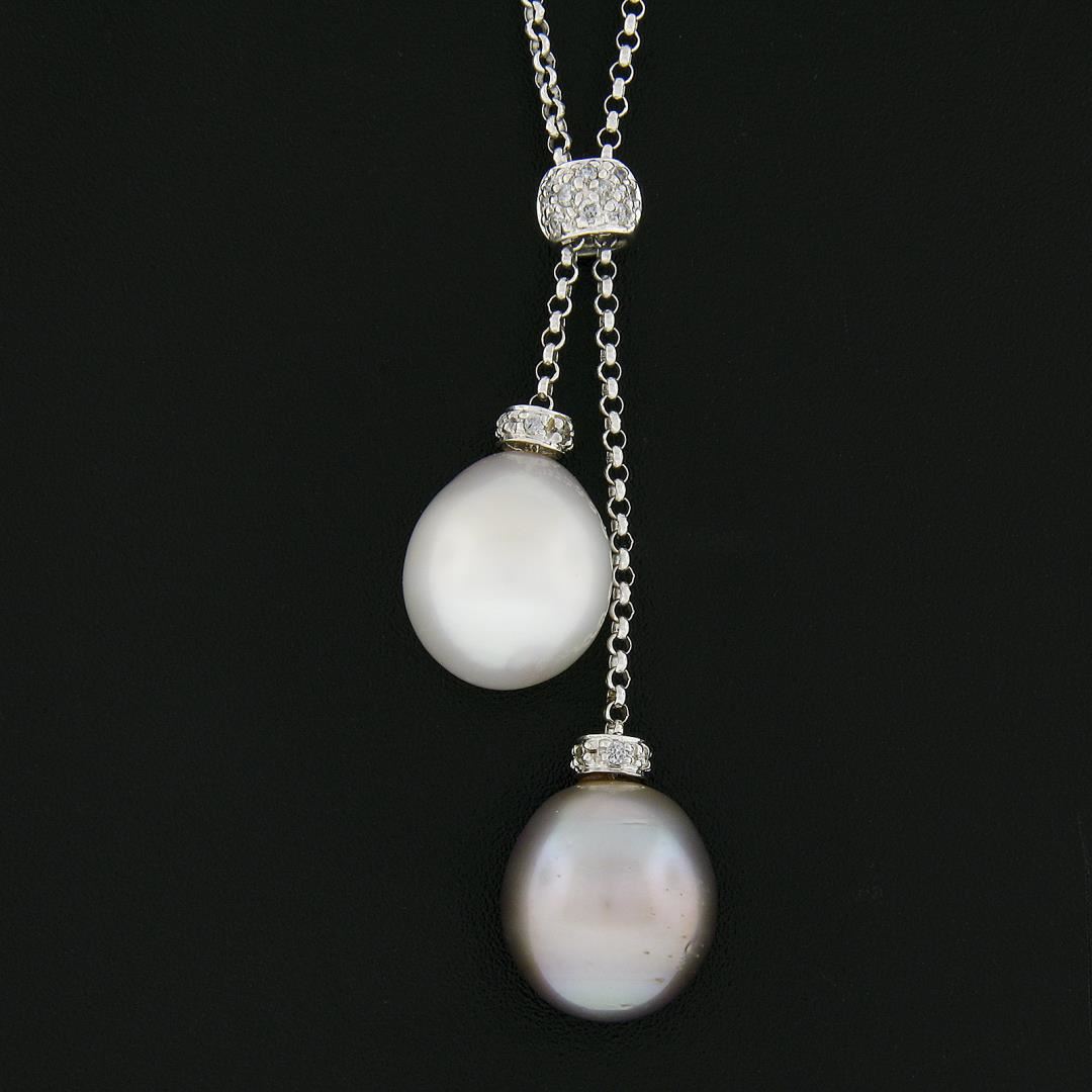 A solid 14k white gold dangle pendant necklace, with 1 ovally round shape cultured tahitian pearl (13.8x12.6mm), 1 ovally round shape cultured pearl (14.2x12.3mm), and 22 round brilliant cut natural diamonds (H/I - SI2/I1 ; 0.22ctw ). 16 inch rolo link chain, 10.06 grams total weight, dangle measures 45.3mm.