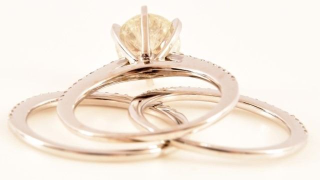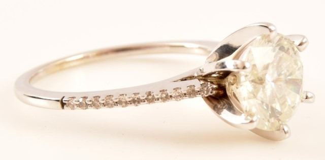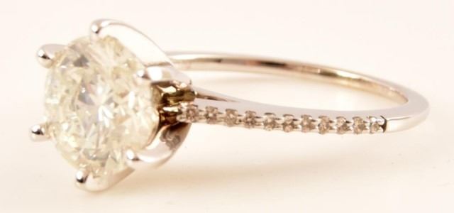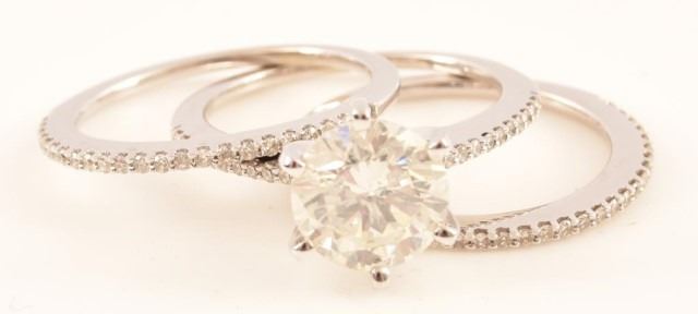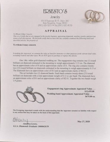 *With Appraisal. Engagement Ring Approximate Value: $12,435. Wedding Band Approximate Value: $675. One 14kt white gold diamond wedding set. The engagement ring contains one (1) round brilliant cut diamond estimated in the mounting to weigh approximately 2.12 cts. The diamond has an approximate color of H and an approximate clarity of I1. The ring also contains twenty-two (22) round brilliant cut diamonds estimated in the mounting to weigh approximately 0.13 ct. The diamonds have an approximate color of H-I and an approximate clarity of SI2-I1. The set includes two (2) diamond bands. Each band contains twenty-three (23) round brilliant cut diamonds wiht a total approximate weight of 0.12 ct. per band. The diamonds have an approximate color of H-I and an approximate clarity of SI2-I1. Together the two bands weigh 2.9 grams.