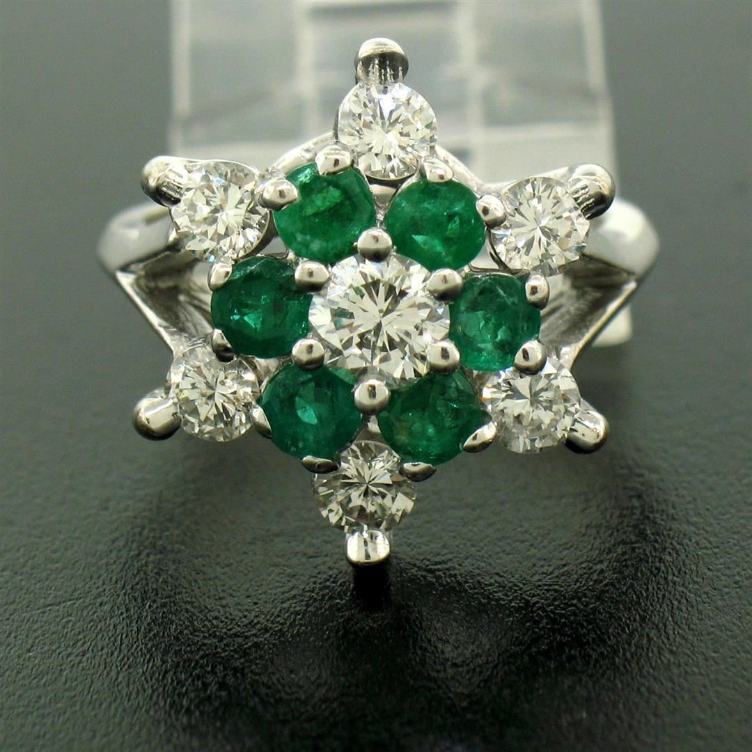 One 14k White Gold 2.25ctw Round Emerald & Diamond Ladies Star Cluster Cocktail Ring. Item Details: Material: 14K Solid White Gold, Weight: 6.2 Grams, Stone(s): (1) Natural Genuine Diamond - Round Brilliant Cut - Prong Set - G Color - VS1 Clarity - 0.35ctw (approx.), (6) Natural Genuine Diamonds - Round Brilliant Cut - Prong Set - H Color - VS2 Clarity - 0.90ctw (approx.), (6) Natural Genuine Emeralds - Round Cut - Prong Set - Rich Green Color - 1.00ctw (approx.), Total Carat Weight: 2.25 (approx.), Ring Size: 5.0, Ring Width: 17.5mm, Ring Height: 10.5mm rise off the finger, Condition: Estate - Excellent condition!