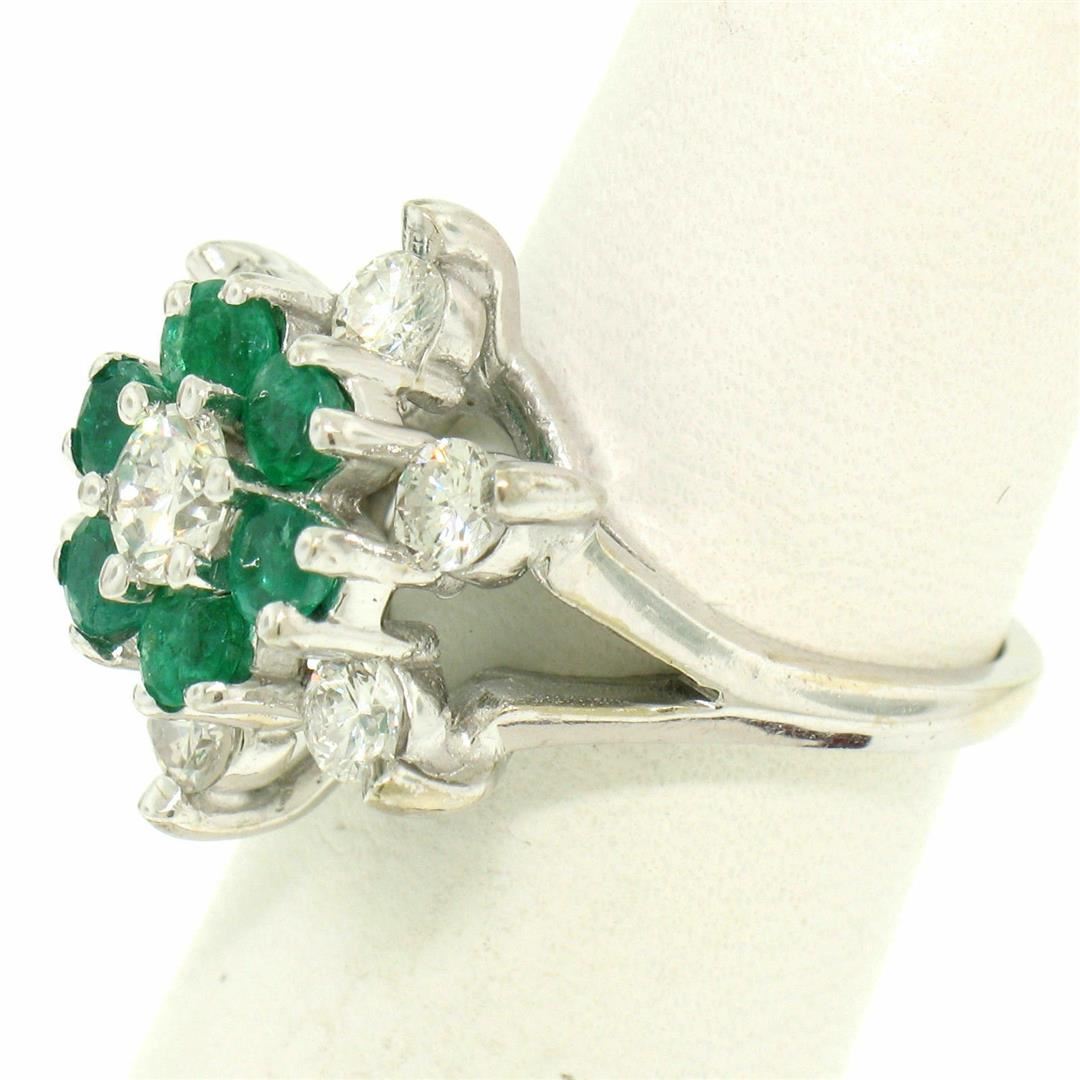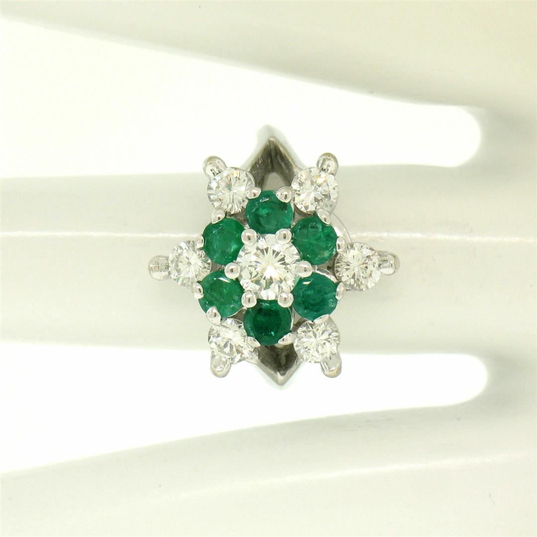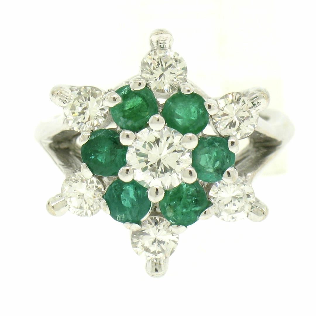 One 14k White Gold 2.25ctw Round Emerald & Diamond Ladies Star Cluster Cocktail Ring. Item Details: Material:  14K Solid White Gold, Weight:  6.2 Grams, Stone(s):  (1) Natural Genuine Diamond - Round Brilliant Cut - Prong Set - G Color - VS1 Clarity - 0.35ctw (approx.), (6) Natural Genuine Diamonds - Round Brilliant Cut - Prong Set - H Color - VS2 Clarity - 0.90ctw (approx.), (6) Natural Genuine Emeralds - Round Cut - Prong Set - Rich Green Color - 1.00ctw (approx.), Total Carat Weight:  2.25 (approx.), Ring Size:  5.0, Ring Width:  17.5mm, Ring Height:  10.5mm rise off the finger, Condition:  Estate - Excellent condition!