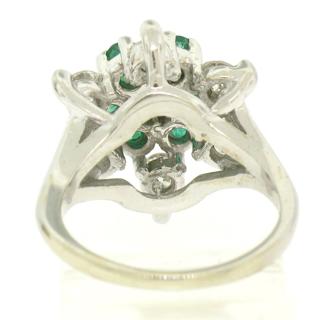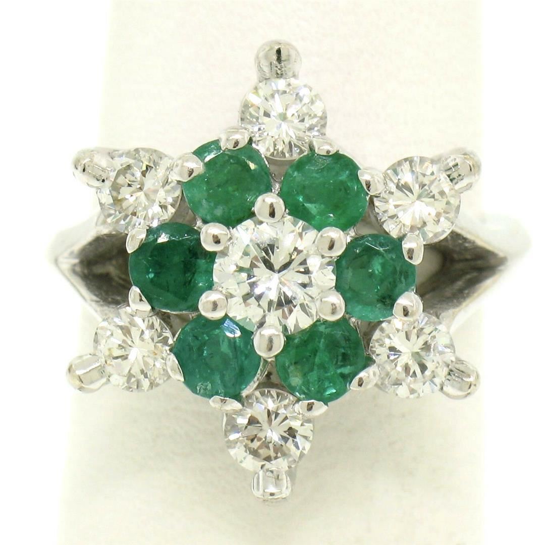 One 14k White Gold 2.25ctw Round Emerald & Diamond Ladies Star Cluster Cocktail Ring. Item Details: Material: 14K Solid White Gold, Weight: 6.2 Grams, Stone(s): (1) Natural Genuine Diamond - Round Brilliant Cut - Prong Set - G Color - VS1 Clarity - 0.35ctw (approx.), (6) Natural Genuine Diamonds - Round Brilliant Cut - Prong Set - H Color - VS2 Clarity - 0.90ctw (approx.), (6) Natural Genuine Emeralds - Round Cut - Prong Set - Rich Green Color - 1.00ctw (approx.), Total Carat Weight: 2.25 (approx.), Ring Size: 5.0, Ring Width: 17.5mm, Ring Height: 10.5mm rise off the finger, Condition: Estate - Excellent condition!