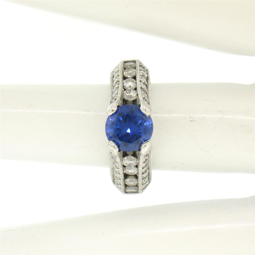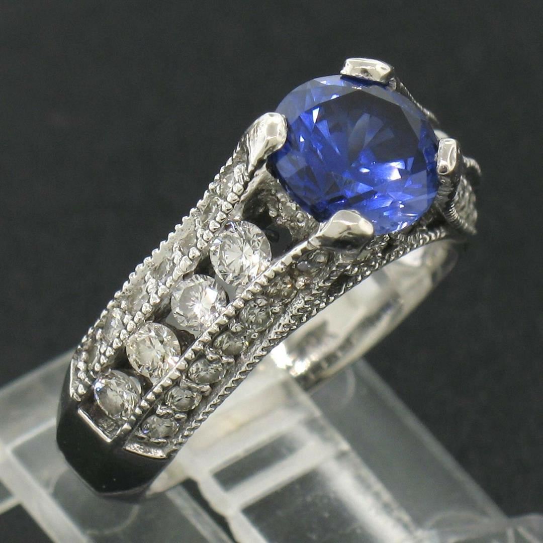 One 14k White Gold 2.50ctw FINE Tanzanite Solitaire Round Diamond Open Milgrain Ring. Item Details: Material: 14K Solid White Gold, Weight: 5.6 Grams, Stone(s): (1) Natural Genuine Tanzanite - Round Brilliant Cut - Prong Set - Very Rich and Vivid Blue Color - 1.60ct (approx.), (50) Natural Genuine Diamonds - Round Brilliant Cut - Channel & Pavé Set - G/H Color - SI1 Clarity - 0.90ctw (approx.), Total Carat Weight: 2.50ctw (approx.), Ring Size: 4.5, Ring Width: 7.03mm, Ring Height: 7.69mm rise off the finger. Condition: Like New!