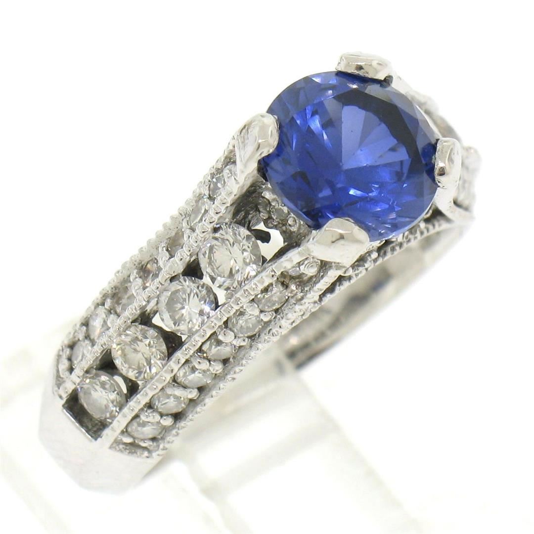 One 14k White Gold 2.50ctw FINE Tanzanite Solitaire Round Diamond Open Milgrain Ring. Item Details: Material: 14K Solid White Gold, Weight: 5.6 Grams, Stone(s): (1) Natural Genuine Tanzanite - Round Brilliant Cut - Prong Set - Very Rich and Vivid Blue Color - 1.60ct (approx.), (50) Natural Genuine Diamonds - Round Brilliant Cut - Channel & Pav� Set - G/H Color - SI1 Clarity - 0.90ctw (approx.), Total Carat Weight: 2.50ctw (approx.), Ring Size: 4.5, Ring Width: 7.03mm, Ring Height: 7.69mm rise off the finger. Condition: Like New!