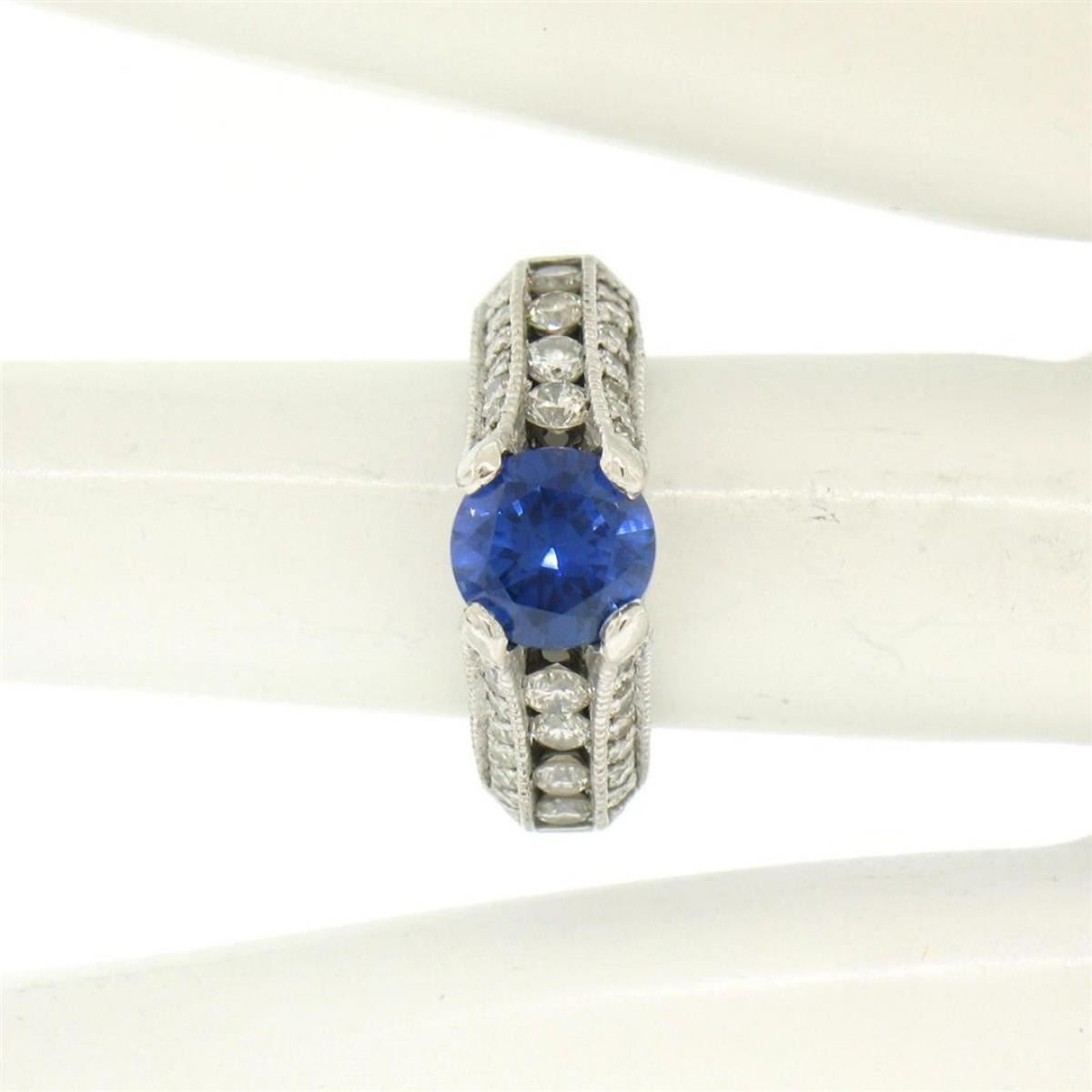 One 14k White Gold 2.50ctw FINE Tanzanite Solitaire Round Diamond Open Milgrain Ring. Item Details: Material: 14K Solid White Gold, Weight: 5.6 Grams, Stone(s): (1) Natural Genuine Tanzanite - Round Brilliant Cut - Prong Set - Very Rich and Vivid Blue Color - 1.60ct (approx.), (50) Natural Genuine Diamonds - Round Brilliant Cut - Channel & Pavé Set - G/H Color - SI1 Clarity - 0.90ctw (approx.), Total Carat Weight: 2.50ctw (approx.), Ring Size: 4.5, Ring Width: 7.03mm, Ring Height: 7.69mm rise off the finger. Condition: Like New!