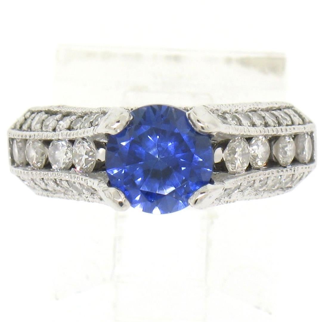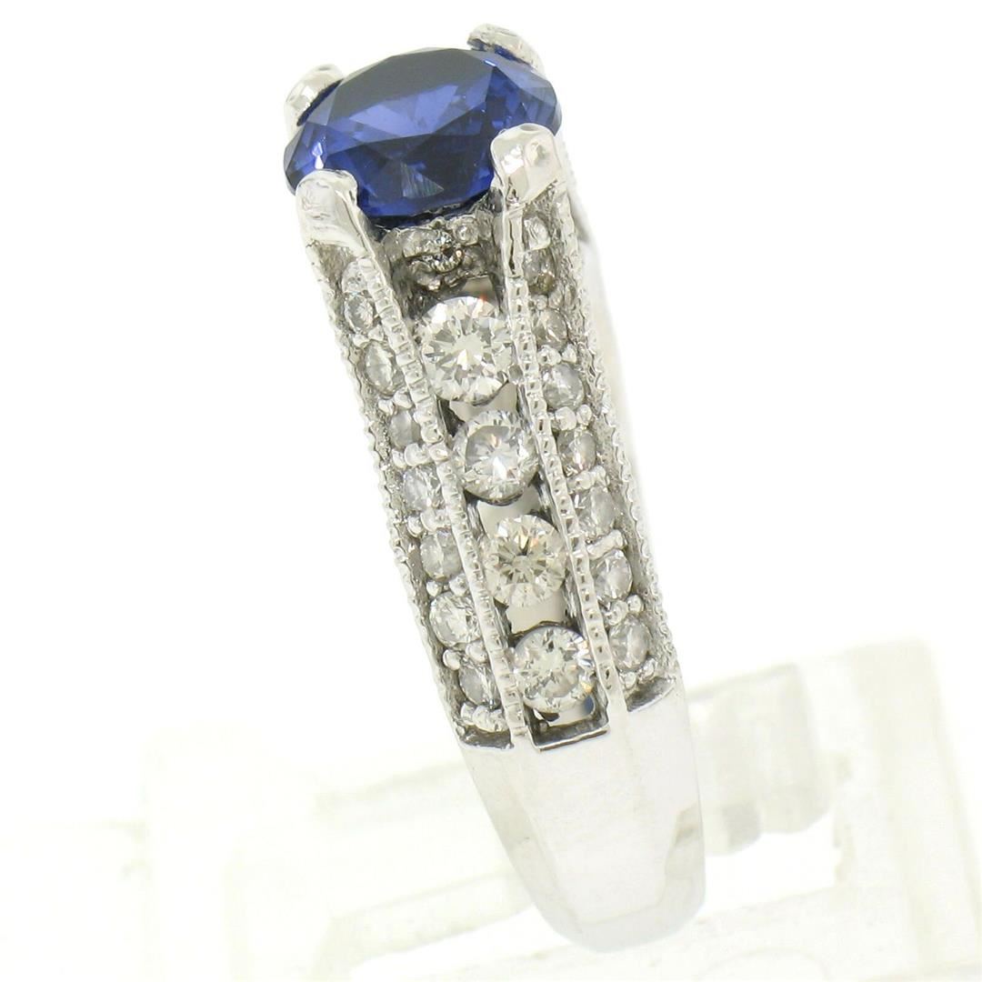 One 14k White Gold 2.50ctw FINE Tanzanite Solitaire Round Diamond Open Milgrain Ring. Item Details: Material: 14K Solid White Gold, Weight: 5.6 Grams, Stone(s): (1) Natural Genuine Tanzanite - Round Brilliant Cut - Prong Set - Very Rich and Vivid Blue Color - 1.60ct (approx.), (50) Natural Genuine Diamonds - Round Brilliant Cut - Channel & Pavé Set - G/H Color - SI1 Clarity - 0.90ctw (approx.), Total Carat Weight: 2.50ctw (approx.), Ring Size: 4.5, Ring Width: 7.03mm, Ring Height: 7.69mm rise off the finger. Condition: Like New!