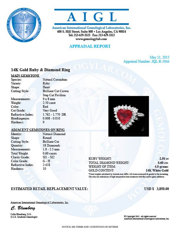 Retail: $3,700.00 ****** 14k White Gold 2.50ct Ruby 0.60ct Diamond Ring ****** Metal: 14k Solid White Gold / Total Item Weight: 4.0 grams / Country Made: United States / / Main Stone: Ruby / Color: Red / Carat Total Weight: 2.50 / Treatment: Filling / Clarity: Type 2 / Cut: Very Good / / Secondary Stone: Diamond / Carat Total Weight: 0.60 / Treatment: None / Color Grade: G - H / Clarity: SI1 - SI2 / Cut: Very Good /