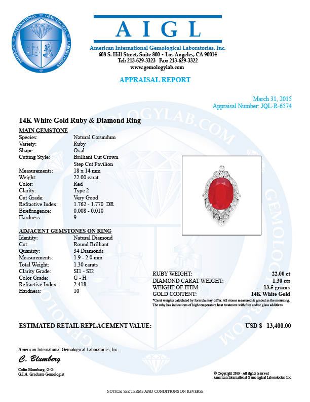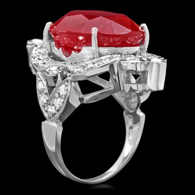Retail: $13,400.00 ****** 14k White Gold 22.00ct Ruby 1.30ct Diamond Ring ****** Metal: 14k Solid White Gold / Size: 7.25 / Total Item Weight: 13.5 grams / Country Made: United States / / Main Stone: Ruby / Color: Red / Carat Total Weight: 22.00 / Treatment: Filling / Clarity: Type 2 / Cut: Very Good / / Secondary Stone: Diamond / Carat Total Weight: 1.30 / Treatment: None / Color Grade: G - H / Clarity: SI1 - SI2 / Cut: Very Good /