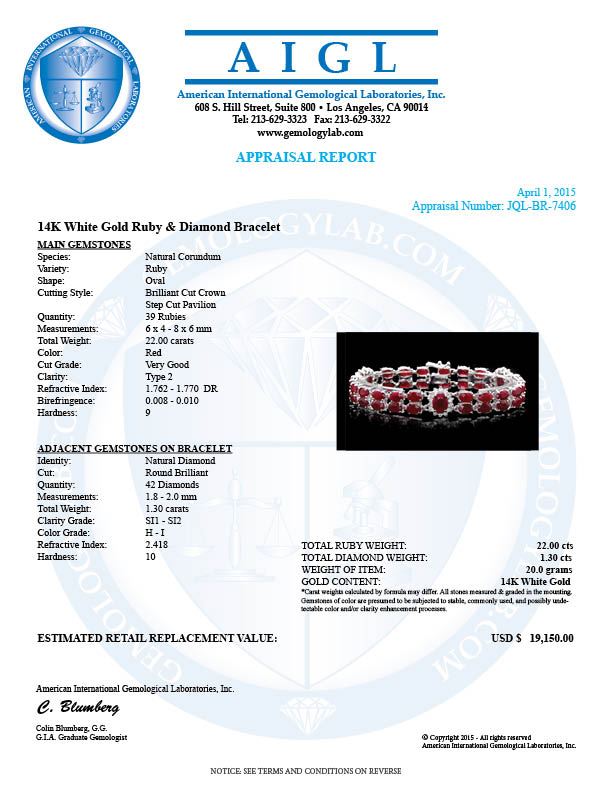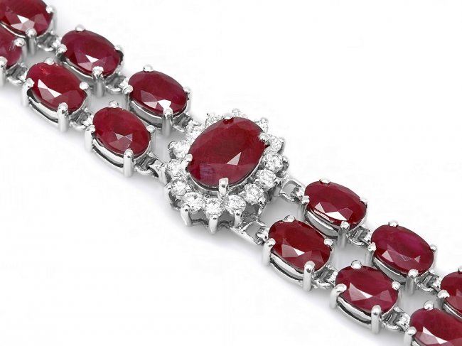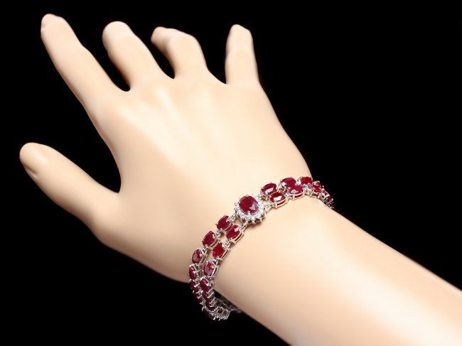 Retail: $18,900.00 ****** 14k White Gold 22ct Ruby 1.30ct Diamond Bracelet ****** Metal: 14k Solid White Gold / Size: 7 / Total Item Weight: 20.0 grams / Country Made: United States / / Main Stone: Ruby / Color: Red / Carat Total Weight: 5.00 / Treatment: None / Clarity: Type 2 / Cut: Very Good / / Secondary Stone: Diamond / Carat Total Weight: 1.30 / Treatment: None / Color Grade: H - I / Clarity: SI1 - SI2 / Cut: Very Good / / Side Stone: Ruby / Color: Red / Carat Total Weight: 17.00 / Treatment: None / Clarity: Type 2 / Cut: Very Good /