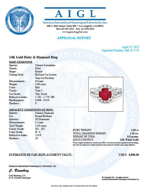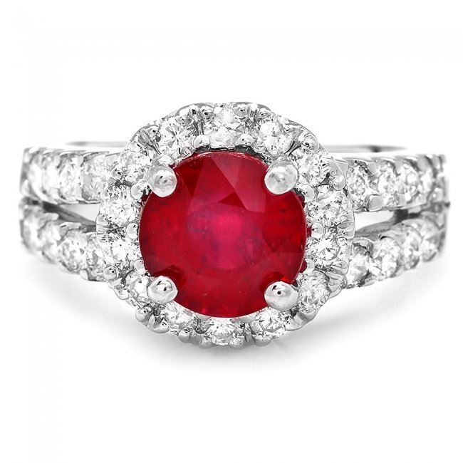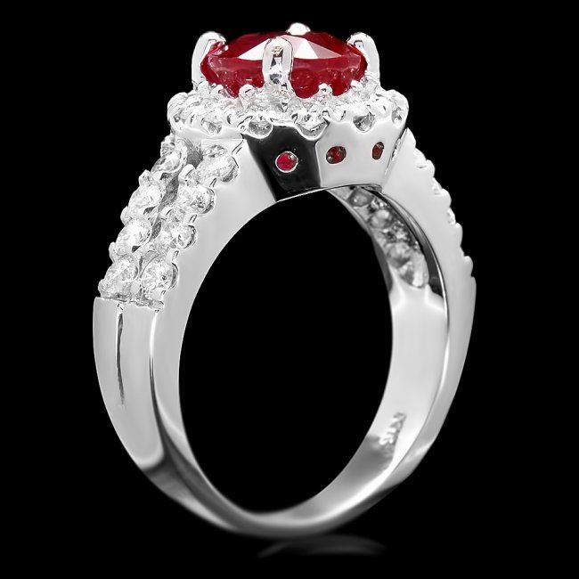 Retail: $8,700.00 ****** 14k White Gold 3.00ct Ruby 1.30ct Diamond Ring ****** Metal: 14k Solid White Gold / Size: 7.75 / Total Item Weight: 8.0 grams / Country Made: United States / / Main Stone: Ruby / Color: Red / Carat Total Weight: 3.00 / Treatment: Filling / Clarity: Type 2 / Cut: Very Good / / Secondary Stone: Diamond / Carat Total Weight: 1.30 / Treatment: None / Color Grade: H - I / Clarity: SI1 - SI2 / Cut: Very Good /