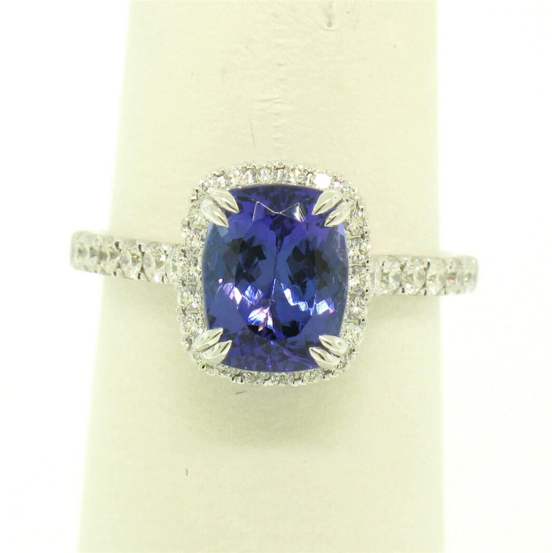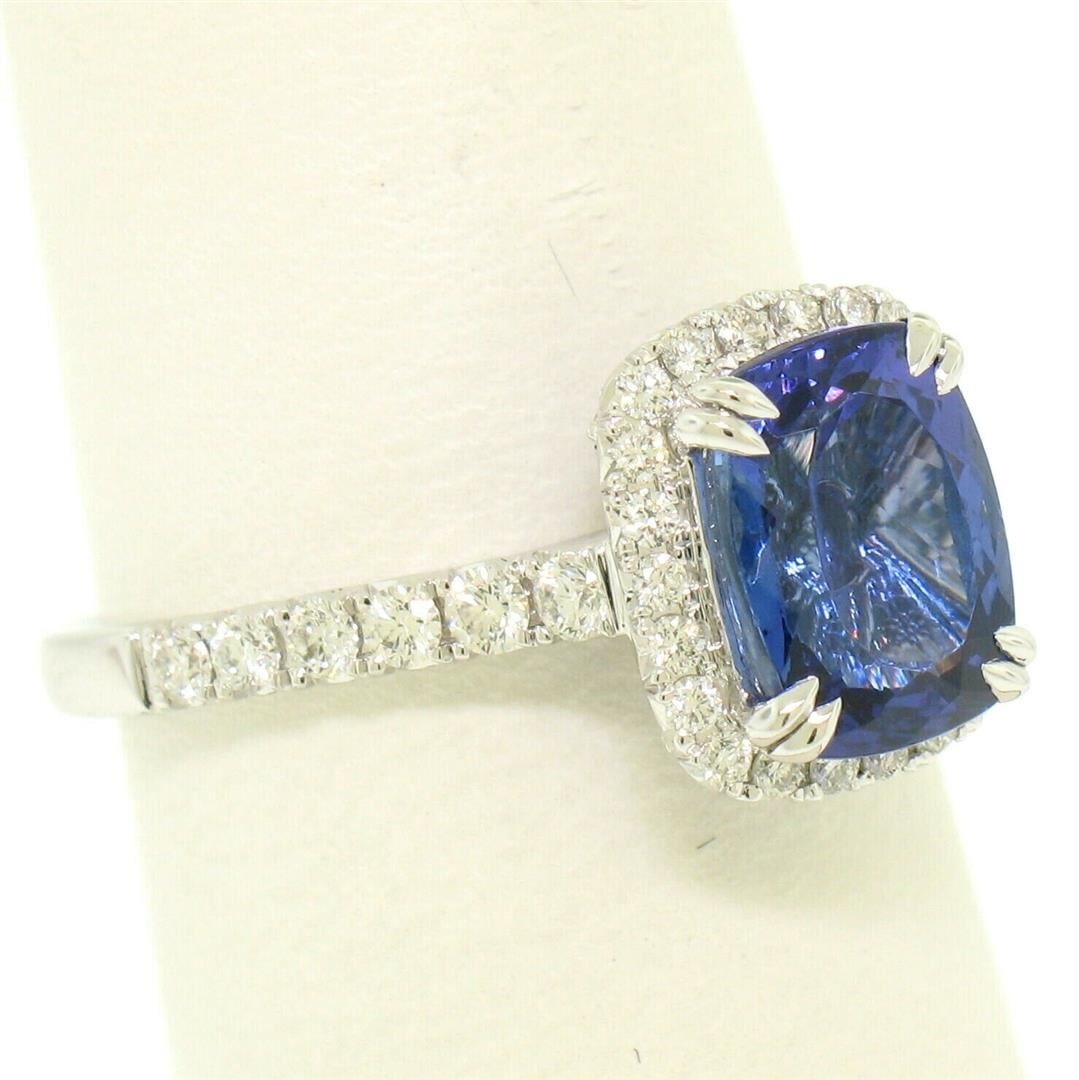 One Modern 14k White Gold 3.03ctw Cushion Cut Tanzanite & Round Diamond Halo Ring. Item Details: Material: Solid 14k White Gold, Weight: 3.4 Grams, Stone(s): (1) Natural Genuine Tanzanite - Cushion Brilliant Cut - Prong Set - Beautiful Bluish Purple Color - 8.95x6.95mm - 2.25ct (approx.), (52) Natural Genuine Diamonds - Round Brilliant Cut - Prong and Bezel Set - G Color - VS2 Clarity - 0.78ctw (approx.), Total Carat Weight: 3.03 (approx.), Ring Size: 6.5, Ring Width: 10.80mm, Condition: Like New!