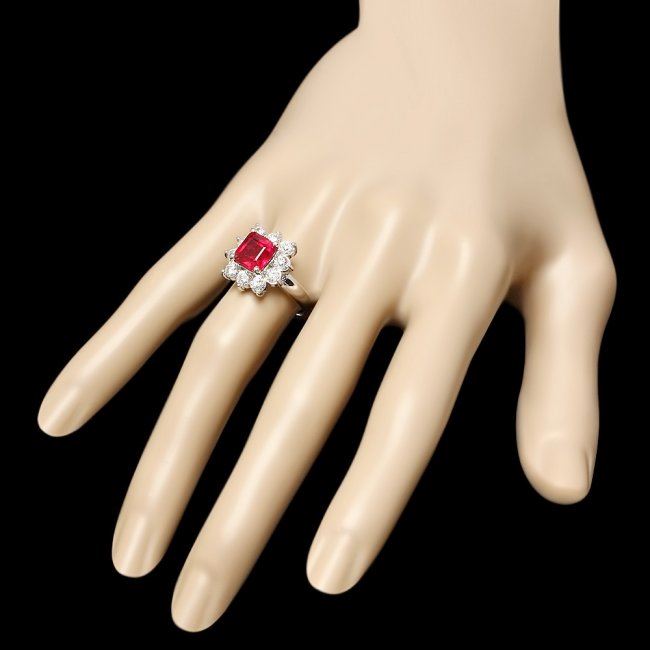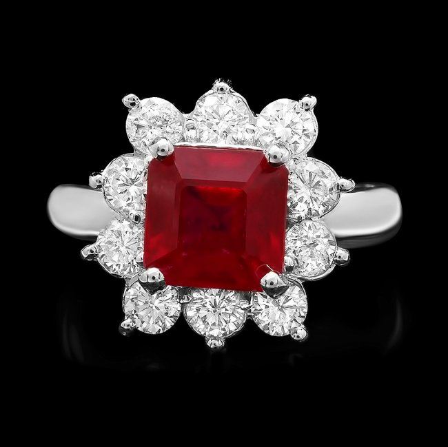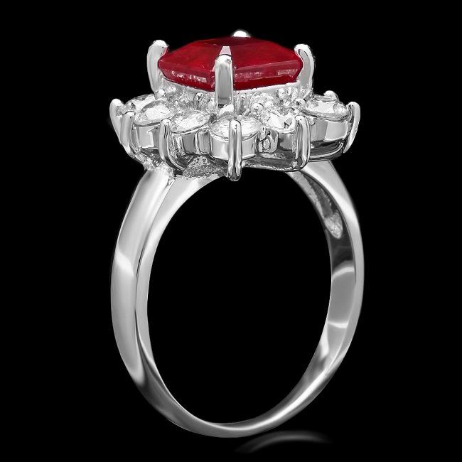 Retail: $8,500.00 ****** 14k White Gold 3.40ct Ruby 1.25ct Diamond Ring ****** Metal: 14k Solid White Gold / Size: 7.75 / Total Item Weight: 6.0 grams / Country Made: United States / / Main Stone: Ruby / Color: Red / Carat Total Weight: 3.40 / Treatment: Filling / Clarity: Type 2 / Cut: Very Good / / Secondary Stone: Diamond / Carat Total Weight: 1.25 / Treatment: None / Color Grade: H - I / Clarity: SI1 - SI2 / Cut: Very Good /
