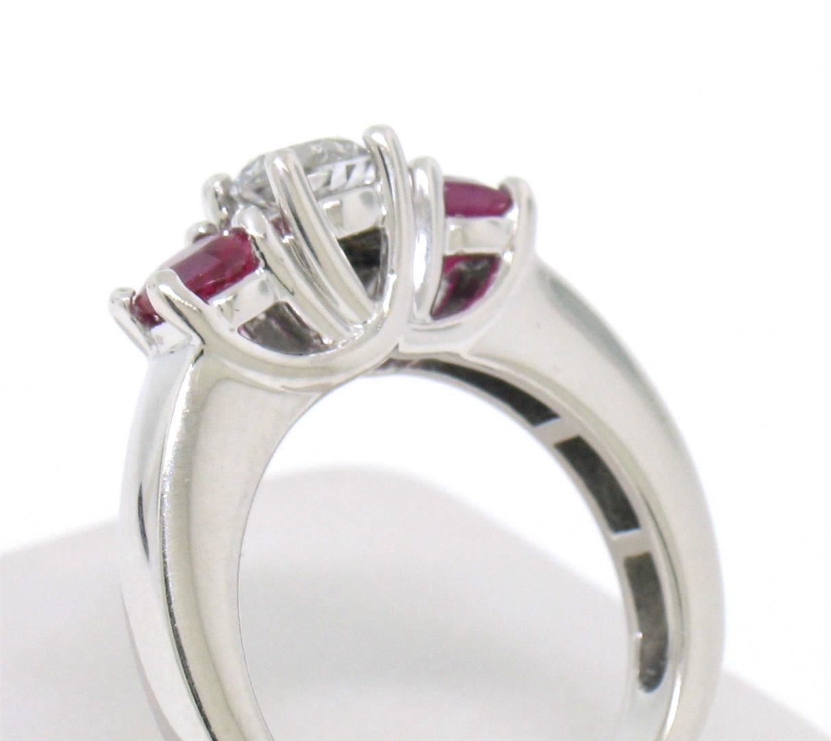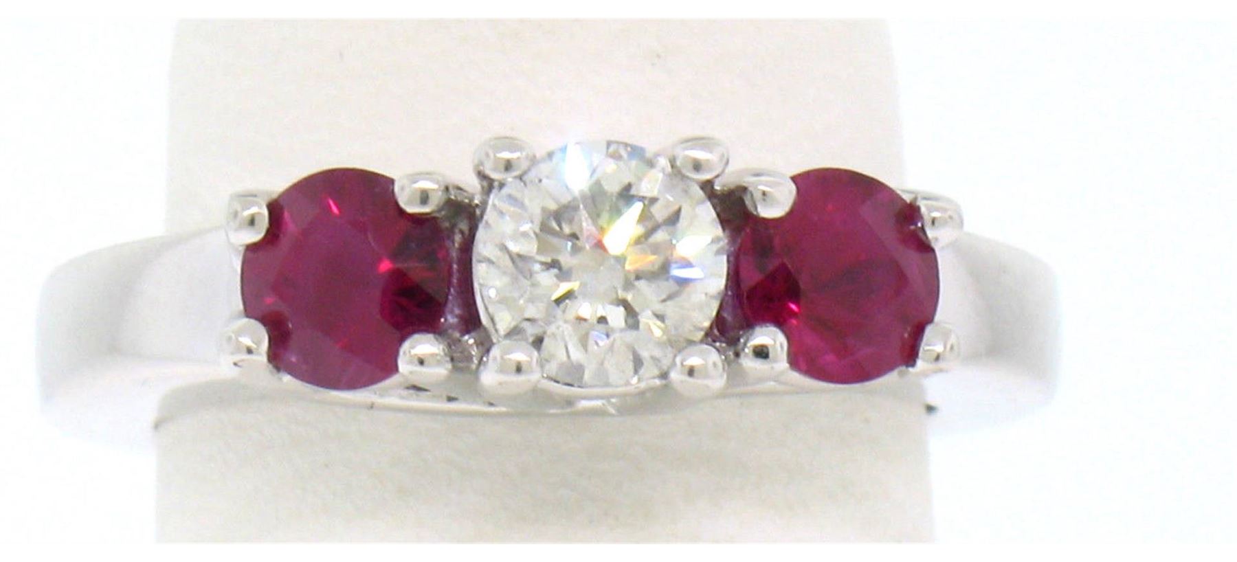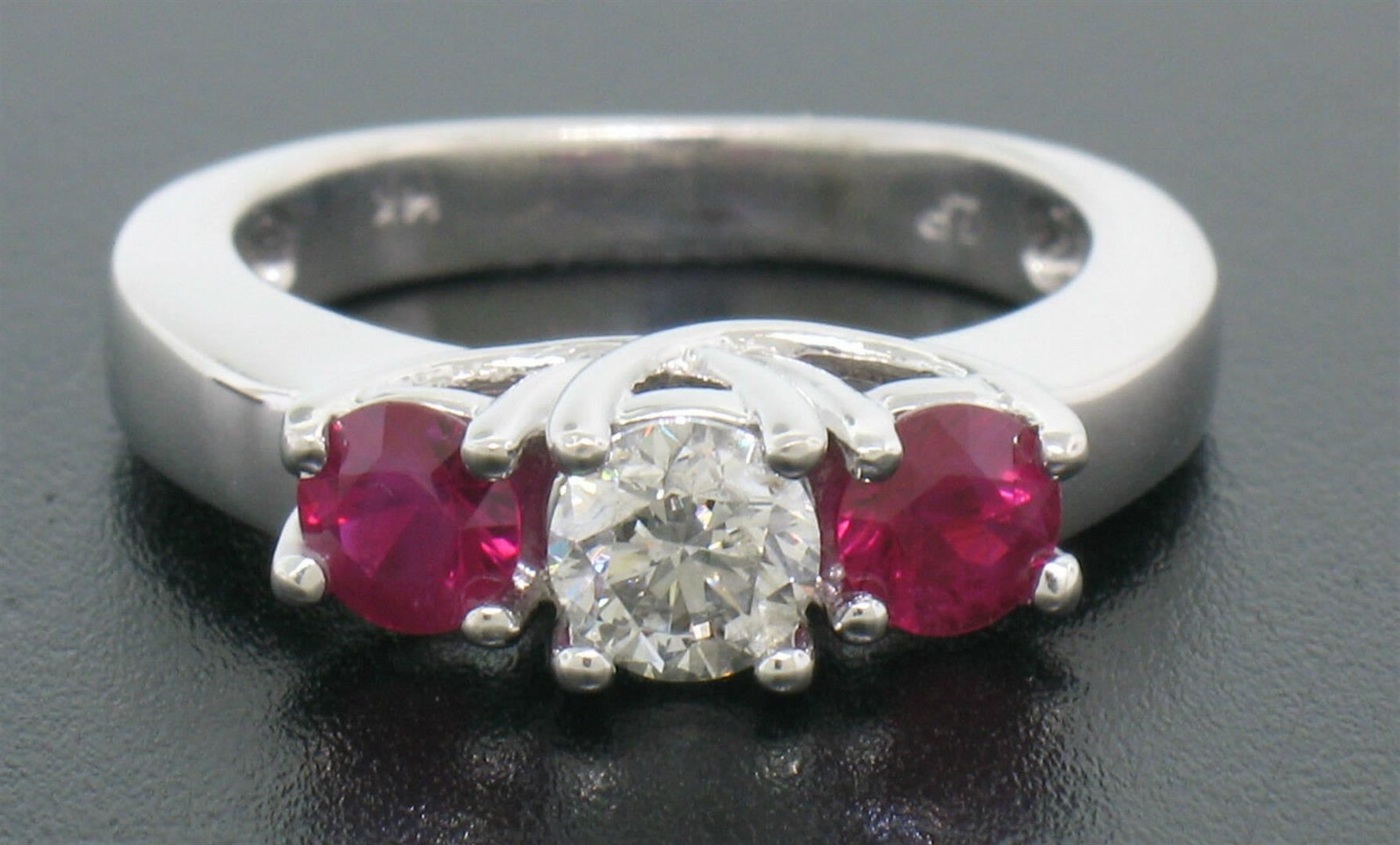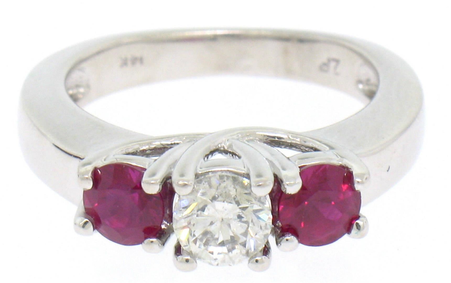 One 14K Solid White Gold Three Stone Ring w/ Rd. Diamond Flanked by 2 Rd. Blood Red Rubies. Item Details: Material: 14K Solid White Gold, Weight: 4.20 Grams , Stone: (1) Natural Genuine Round Brilliant White Diamond - 0.42ctw - Clarity: VS2 - Color: G , (2) Natural Genuine round Rubies - 0.82 CTW - Color: Brilliant Blood Red., Dimensions/Size: Ring Size: 4.25. We can size this ring to fit. Measures 14.34 mm Side to Side X 5.10 mm Wide (Knuckle to knuckle), Condition: New !!!