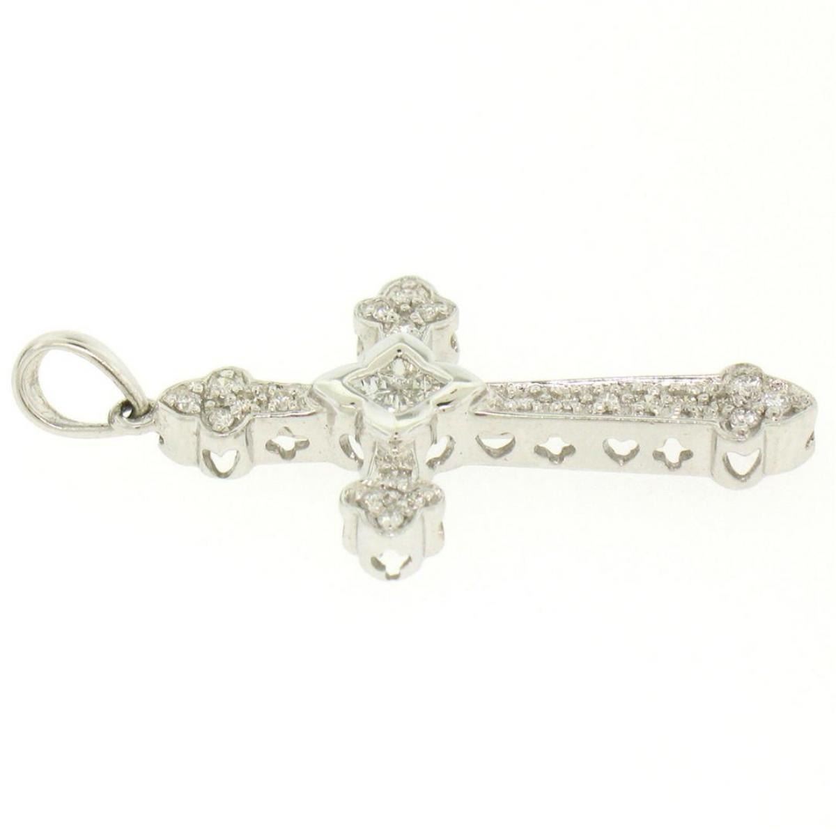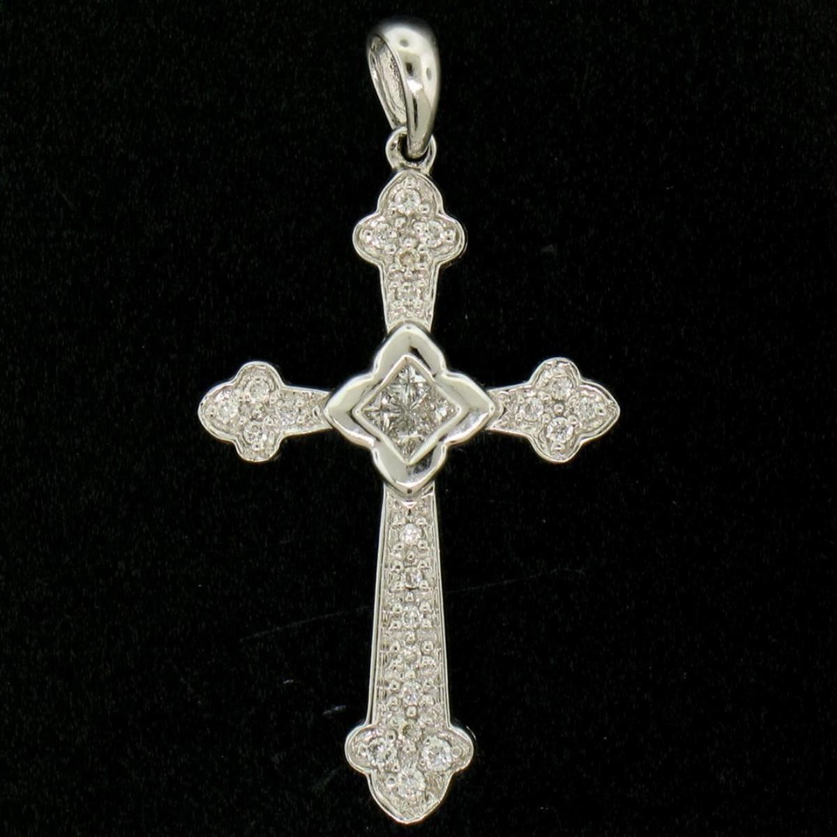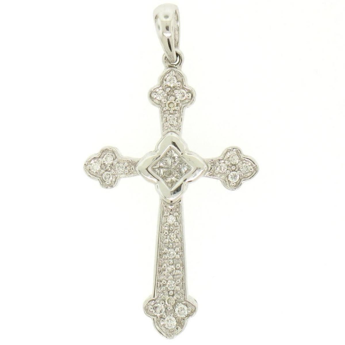 One NEW 14k White Gold .33ctw Invisible Princess & Pave Round Diamond Cross Pendant. Item Details: Material: 14K Solid White Gold, Weight: 2.5 Grams, Stone(s): (4) Natural Genuine Diamonds - Princess Cut - Invisible Set - SI1 Clarity - G/H Color, (21) Natural Genuine Diamonds - Round Brilliant Cut - Pavé Set - SI1 Clarity - G/H Color, Total Carat Weight: 0.33ctw (approx.), Chain Type: Not Included, Width: 17.86mm, Height (w/ Bail): 34.47mm. Height (w/o Bail): 29.64mm. Thickness: 3.66mm. Bail Measurements (Inside): 3.10x4.15mm. Condition: Brand New w/o Tag!