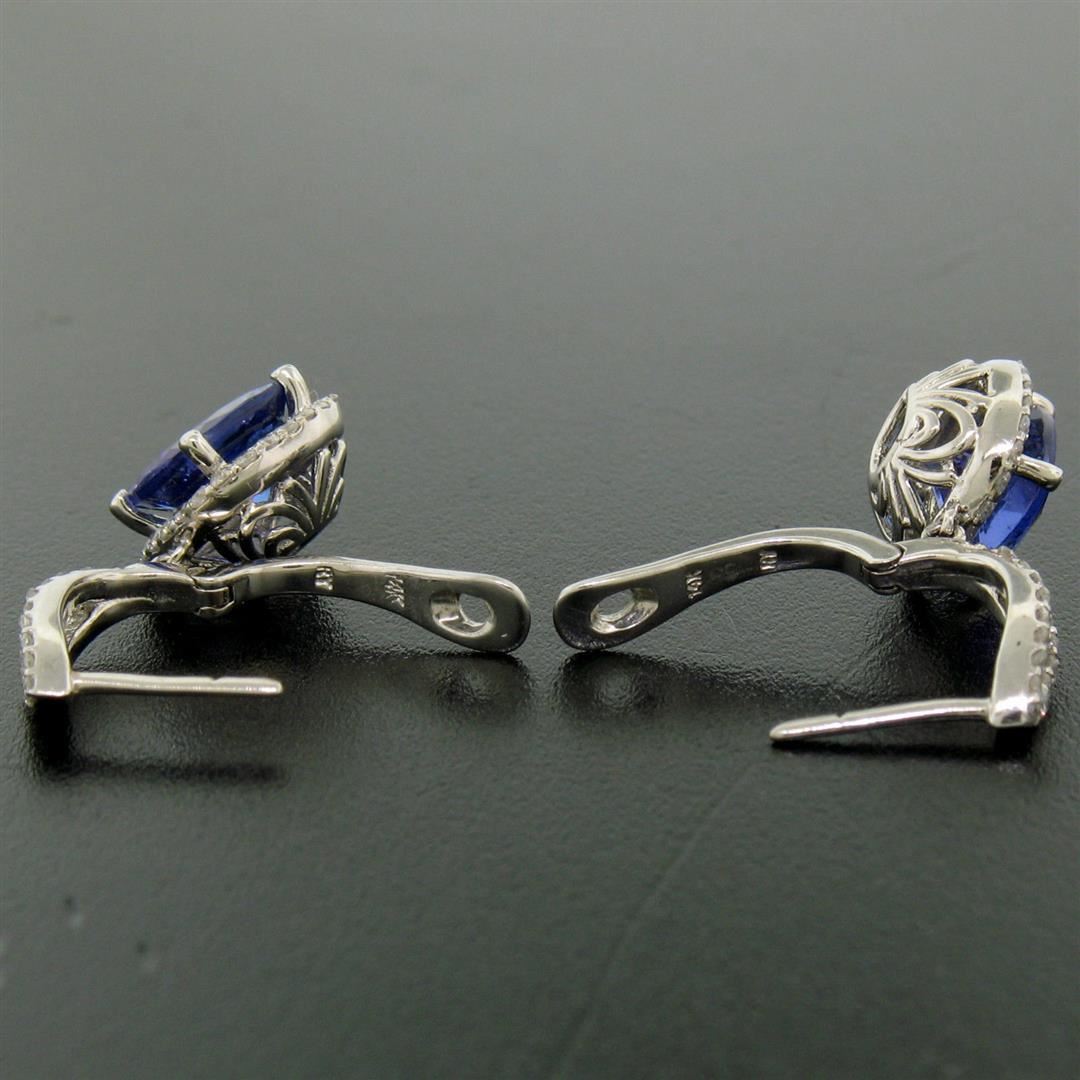 This gorgeous pair of dangle earrings is crafted in solid 14k white gold and features 2 cushion cut, approximately 1.80 carat, prong set tanzanite solitaires with diamond halos. Each earring has a 24 round brilliant cut diamond halo and an additional 18 round brilliant diamonds on top. The tanzanites are a rich and vibrant violet-blue color and truly are fine quality. The diamonds are very brilliant and accent the tanzanite solitaires very nicely. Enjoy!