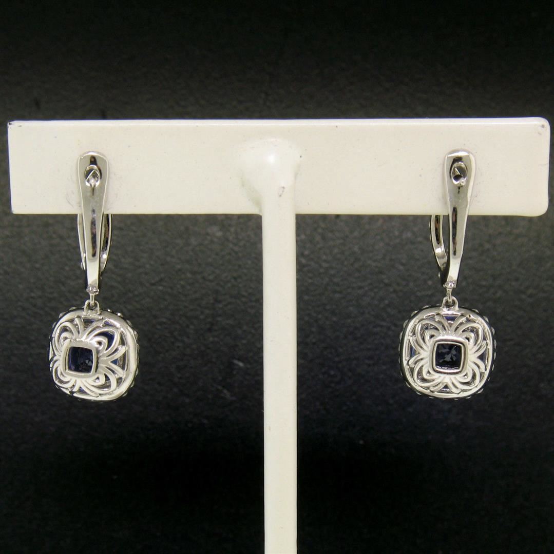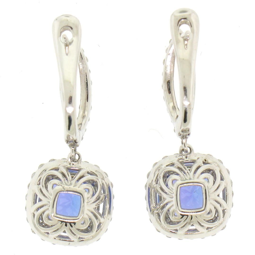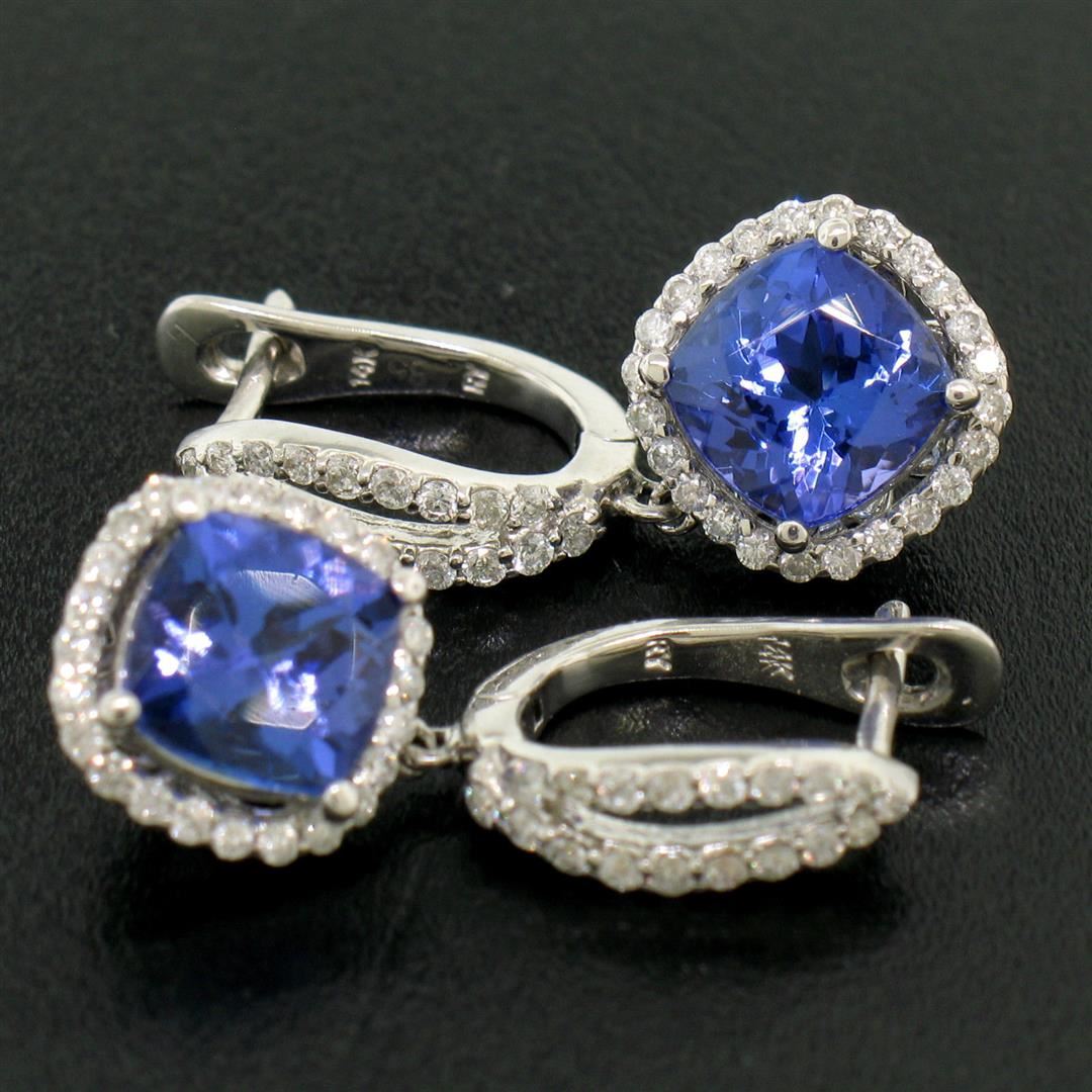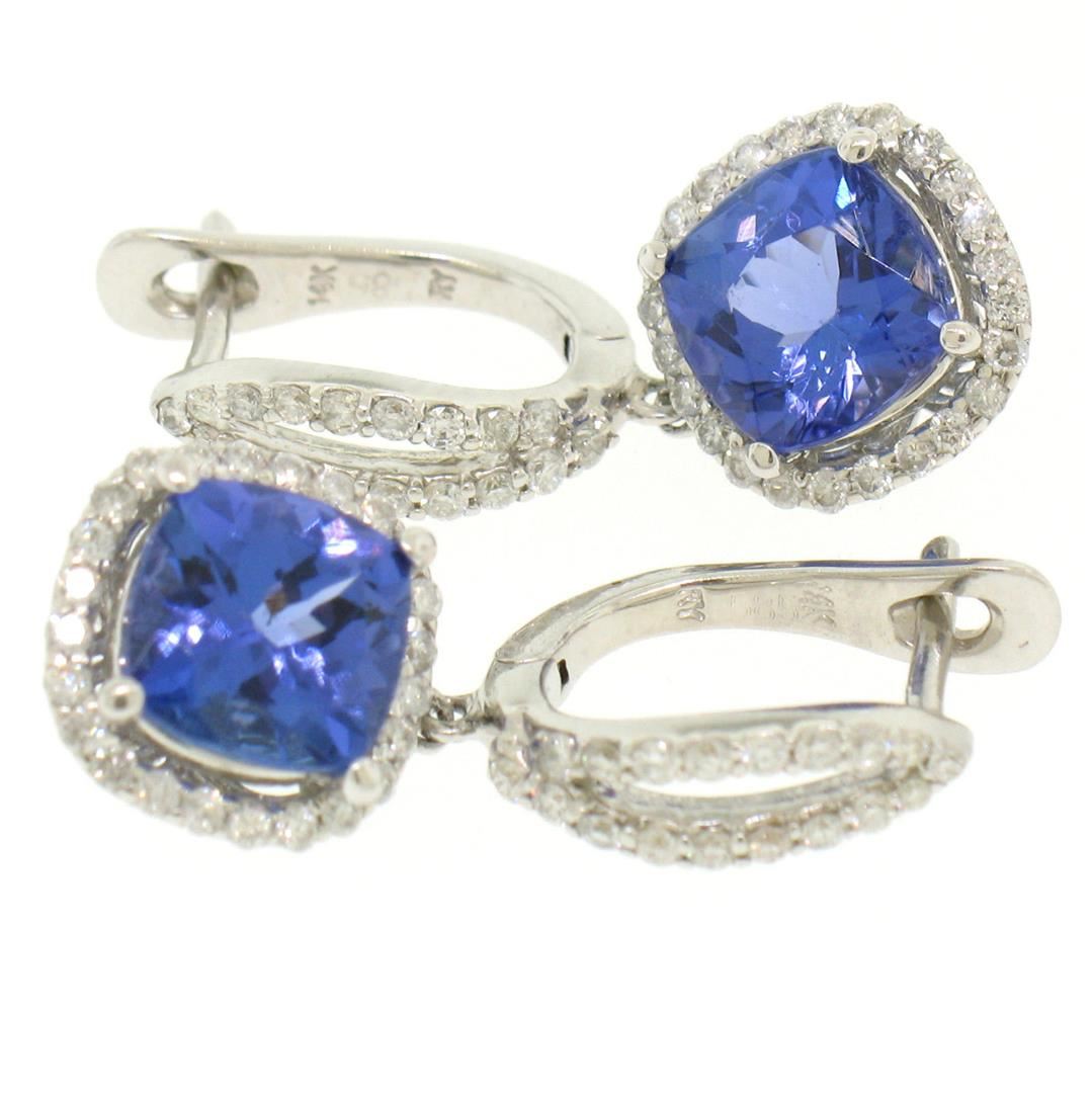 One Pair 14k White Gold 4.15ctw Cushion Tanzanite Dangle Earrings w/ Pavé Diamond Halos. Item Details: Material: 14k Solid White Gold, Weight: 4.5 Grams, Stone(s): (2) Natural Genuine Tanzanite - Cushion Cut - Prong Set - Rich and Vibrant Violet Blue Color - 3.60 ctw (approx.), (84) Natural Genuine Diamonds - Round Brilliant Cut - Prong Set - SI1 Clarity - H Color - 0.55ctw (approx.), Total Carat Weight: 4.15 (approx.), Backing: Snap Closure (Pierced ears required.), Width: 9.86mm, Height: 23.61mm, Thickness: 6.68mm, Dangle Length: 10.72mm, Condition: Like New!