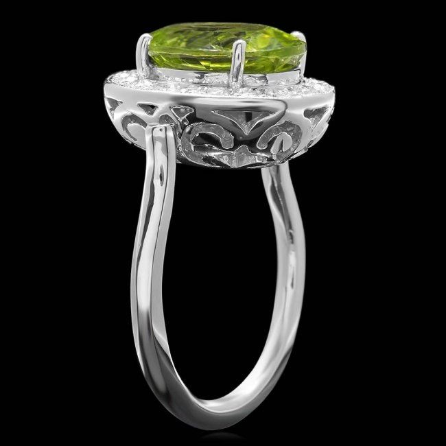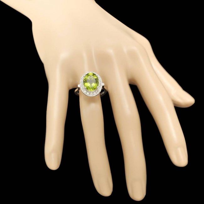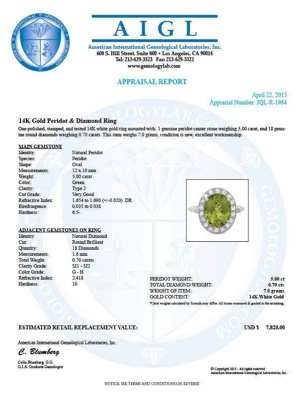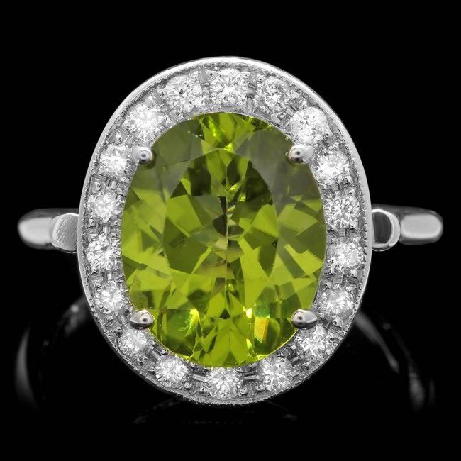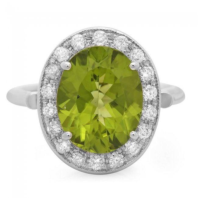 Retail: $7,700.00 ****** 14k White Gold 5.00ct Peridot 0.70ct Diamond Ring ****** Metal: 14k Solid White Gold / Size: 7 / Total Item Weight: 7.0 grams / / Main Stone: Peridot / Color: Green / Carat Total Weight: 5.00 / Treatment: None / Clarity: Type 2 / Cut: Very Good / / Secondary Stone: Diamond / Carat Total Weight: 0.70 / Treatment: None / Color Grade: G - H / Clarity: SI1 - SI2 / Cut: Very Good /