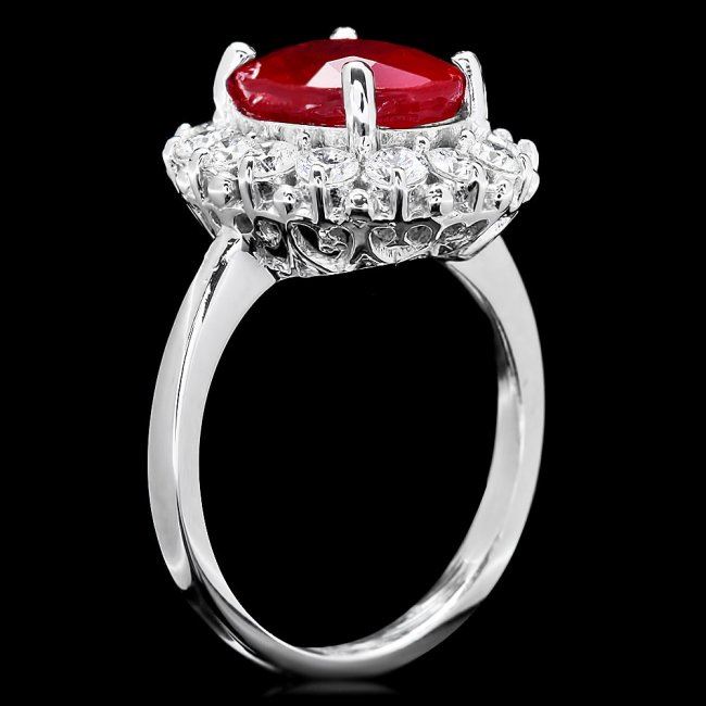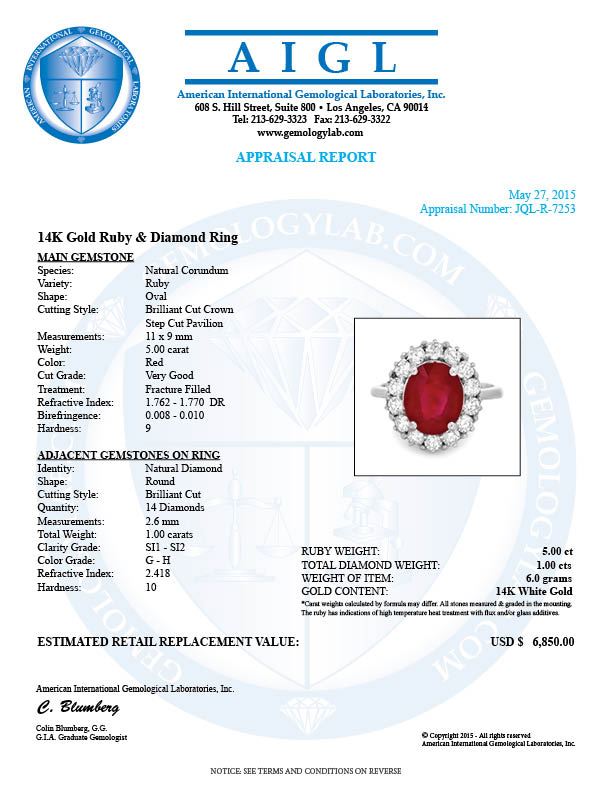 Retail: $6,900.00 ****** 14k White Gold 5.00ct Ruby 1.00ct Diamond Ring ****** Metal: 14k Solid White Gold / Size: 7.5 / Total Item Weight: 6.0 grams / Country Made: United States / / Main Stone: Ruby / Color: Red / Carat Total Weight: 5.00 / Treatment: Filling / Clarity: Type 2 / Cut: Very Good / / Secondary Stone: Diamond / Carat Total Weight: 1.00 / Treatment: None / Color Grade: G - H / Clarity: SI1 - SI2 / Cut: Very Good /
