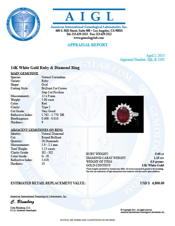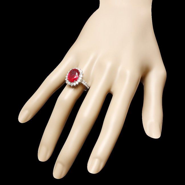 Retail: $6,750.00 ****** 14k White Gold 5.00ct Ruby 1.15ct Diamond Ring ****** Metal: 14k Solid White Gold / Size: 7 / Total Item Weight: 6.0 grams / Country Made: United States / / Main Stone: Ruby / Color: Red / Carat Total Weight: 5.00 / Treatment: Filling / Clarity: Type 2 / Cut: Very Good / / Secondary Stone: Diamond / Carat Total Weight: 1.15 / Treatment: None / Color Grade: G - H / Clarity: SI1 - SI2 / Cut: Very Good /