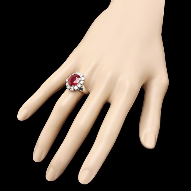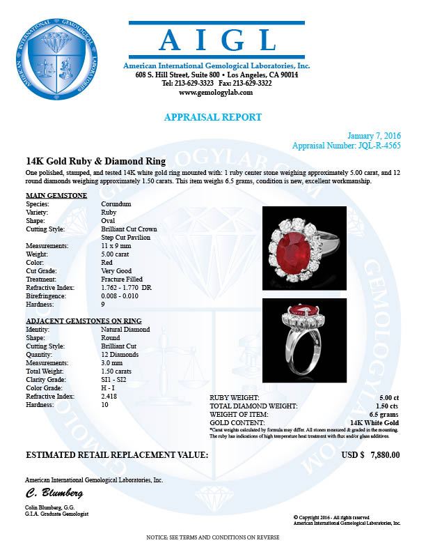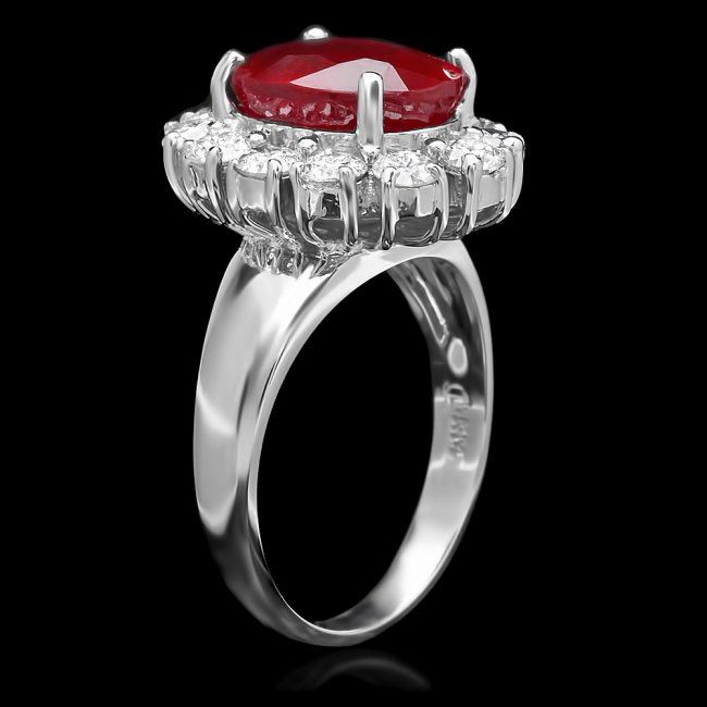Retail: $7,800.00 ****** 14k White Gold 5.00ct Ruby 1.50ct Diamond Ring ****** Metal: 14k Solid White Gold / Size: 7 / Total Item Weight: 6.5 grams / Country Made: United States / / Main Stone: Ruby / Color: Red / Carat Total Weight: 5.00 / Treatment: Filling / Clarity: Type 2 / Cut: Very Good / / Secondary Stone: Diamond / Carat Total Weight: 1.50 / Treatment: None / Color Grade: H - I / Clarity: SI1 - SI2 / Cut: Very Good /