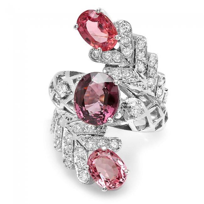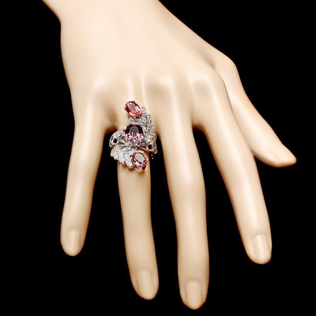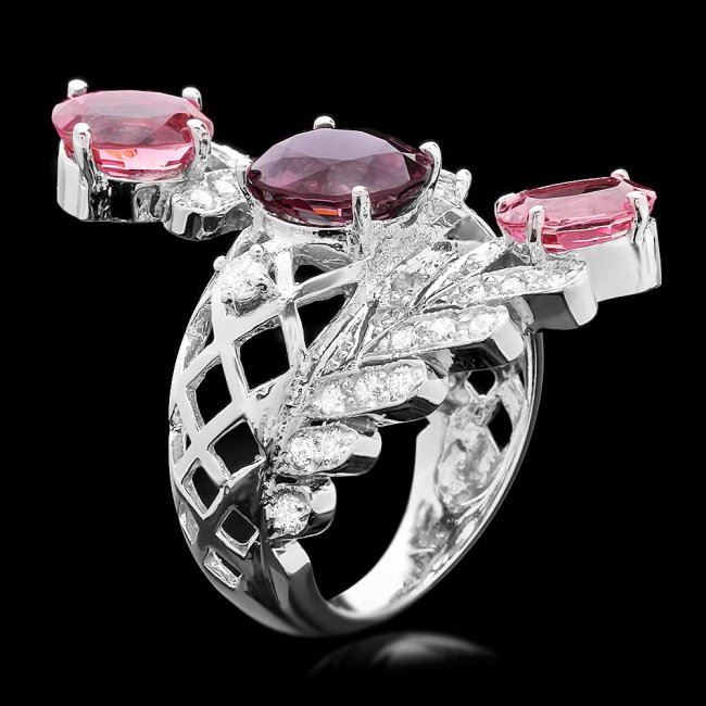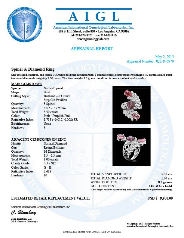 Retail: $9,800.00 ****** 14k White Gold 5.5ct Spinel 1.00ct Diamond Ring ****** Metal: 14k Solid White Gold / Size: 6.5 / Total Item Weight: 8.5 grams / Country Made: United States / / Main Stone: Spinel / Color: Purple / Carat Total Weight: 2.00 / Treatment: None / Clarity: Type 2 / Cut: Very Good / / Secondary Stone: Diamond / Carat Total Weight: 1.00 / Treatment: None / Color Grade: G - H / Clarity: SI1 - SI2 / Cut: Very Good / / Side Stone: Spinel / Color: Pink / Carat Total Weight: 3.50 / Treatment: None / Clarity: Type 2 / Cut: Very Good /