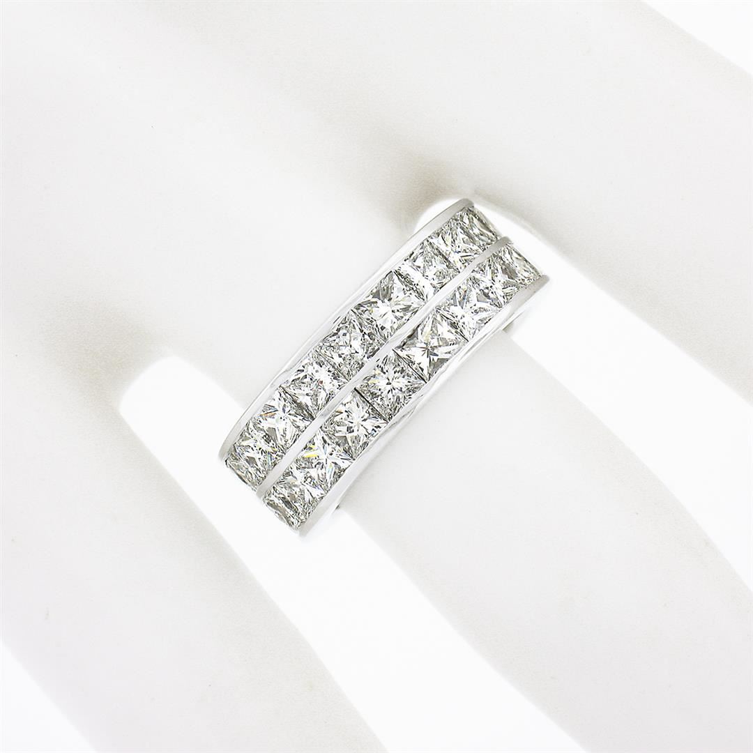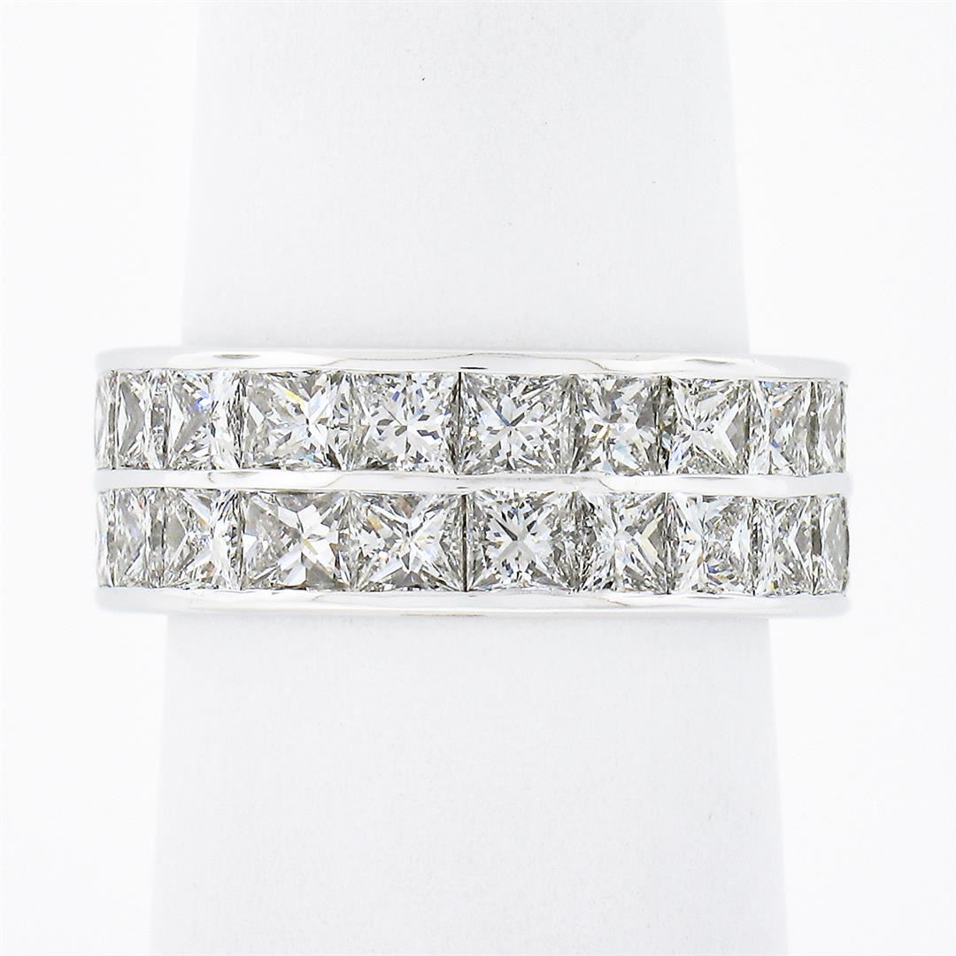A solid 14k white gold eternity band ring, with 44 princess cut natural diamonds (G/H - VVS2/VS1 ; 6.0ctw). The ring is size 6.0, weighs a total of 5.5 grams, and measures 7.20mm wide.