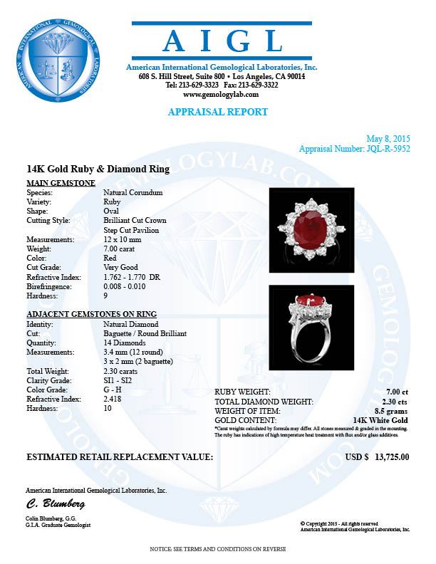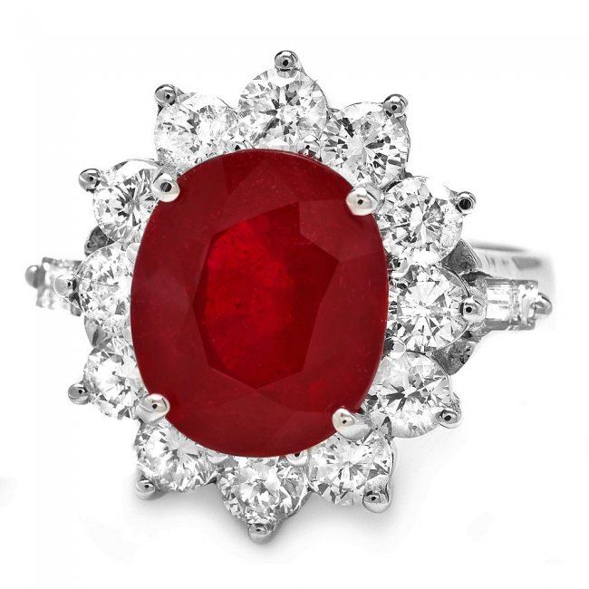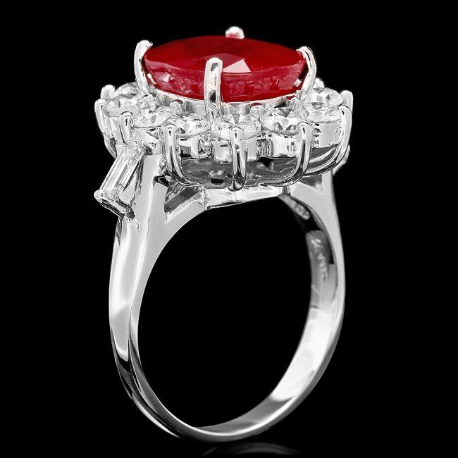 Retail: $13,620.00 ****** 14k White Gold 7.00ct Ruby 2.3ct Diamond Ring ****** Metal: 14k Solid White Gold / Size: 5.75 / Total Item Weight: 8.5 grams / Country Made: United States / / Main Stone: Ruby / Color: Red / Carat Total Weight: 7.00 / Treatment: Filling / Clarity: Type 2 / Cut: Very Good / / Secondary Stone: Diamond / Carat Total Weight: 1.80 / Treatment: None / Color Grade: G - H / Clarity: SI1 - SI2 / Cut: Very Good / / Side Stone: Diamond / Color: White / Carat Total Weight: 0.50 / Treatment: None / Color Grade: G - H / Clarity: SI1 - SI2 / Cut: Very Good /