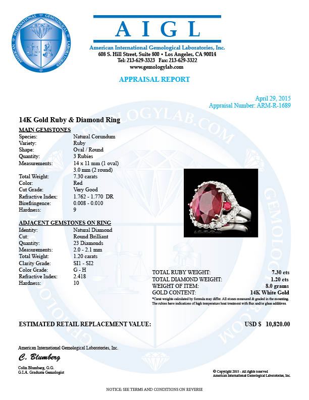 Retail: $10,900.00 ****** 14k White Gold 7.3ct Ruby 1.20ct Diamond Ring ****** Metal: 14k Solid White Gold / Size: 7 / Total Item Weight: 8.0 grams / Country Made: United States / / Main Stone: Ruby / Color: Red / Carat Total Weight: 7.00 / Treatment: Filling / Clarity: Type 2 / Cut: Very Good / / Secondary Stone: Diamond / Carat Total Weight: 1.20 / Treatment: None / Color Grade: G - H / Clarity: SI1 - SI2 / Cut: Very Good / / Side Stone: Ruby / Color: Pink / Carat Total Weight: 0.30 / Treatment: Filling / Clarity: Type 2 / Cut: Very Good /