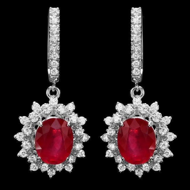 Retail: $8,600.00 ****** 14k White Gold 7.6ct Ruby 1.70ct Diamond Earrings ****** Metal: 14k Solid White Gold / Total Item Weight: 8.5 grams / Country Made: United States / / Main Stone: Ruby / Color: Red / Carat Total Weight: 7.6 / Treatment: Filling / Clarity: Type 2 / Cut: Very Good / / Secondary Stone: Diamond / Carat Total Weight: 1.70 / Treatment: None / Color Grade: G - H / Clarity: SI1 - SI2 / Cut: Very Good /