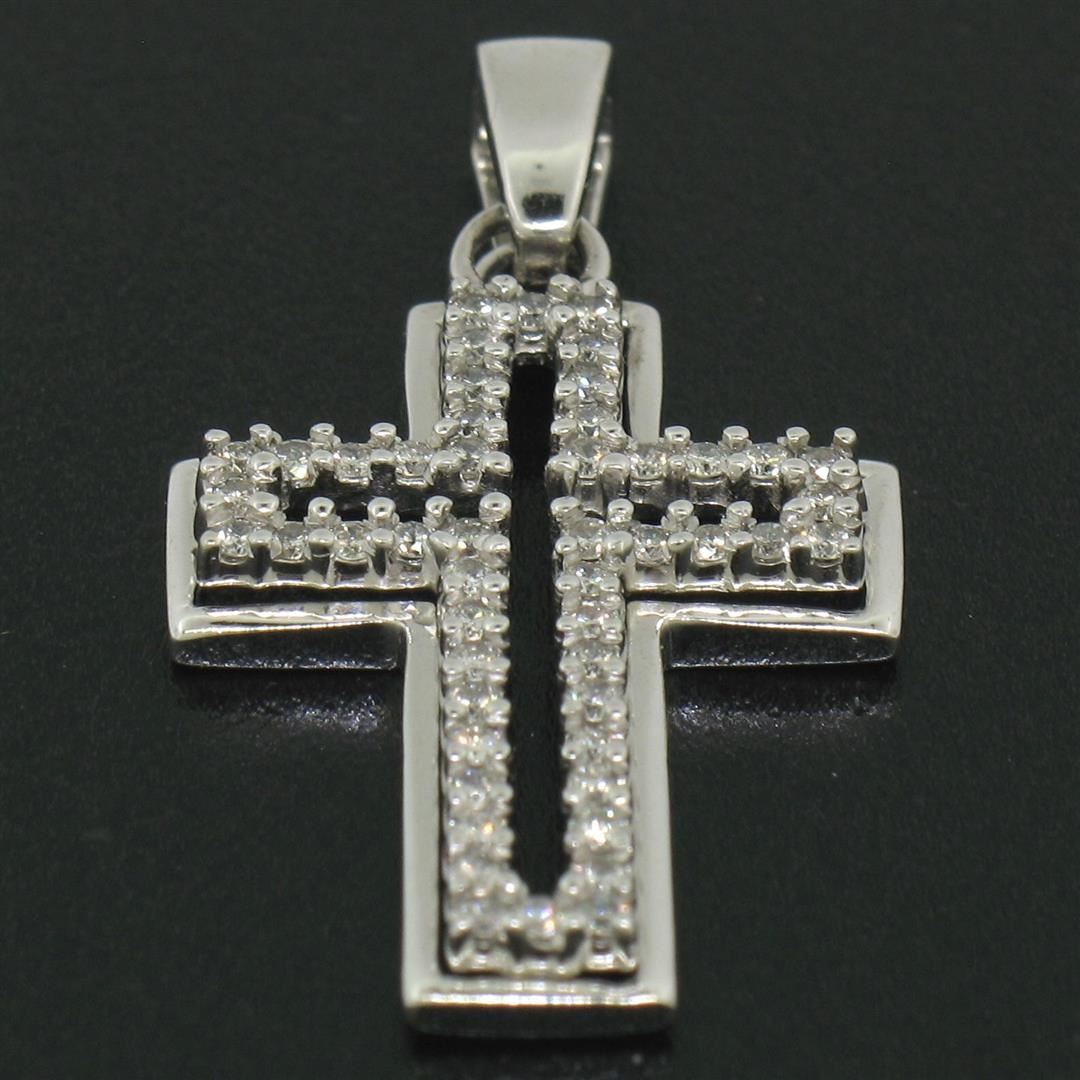 An estate solid 14k white gold cross double floating pendant, with 50 round brilliant cut natural diamonds (G - SI1; 0.75ctw). The pendant weighs a total of 4.07 grams, measures 34.60x18.50mm including the bail, and the inside of the bail measures 2.35x4.