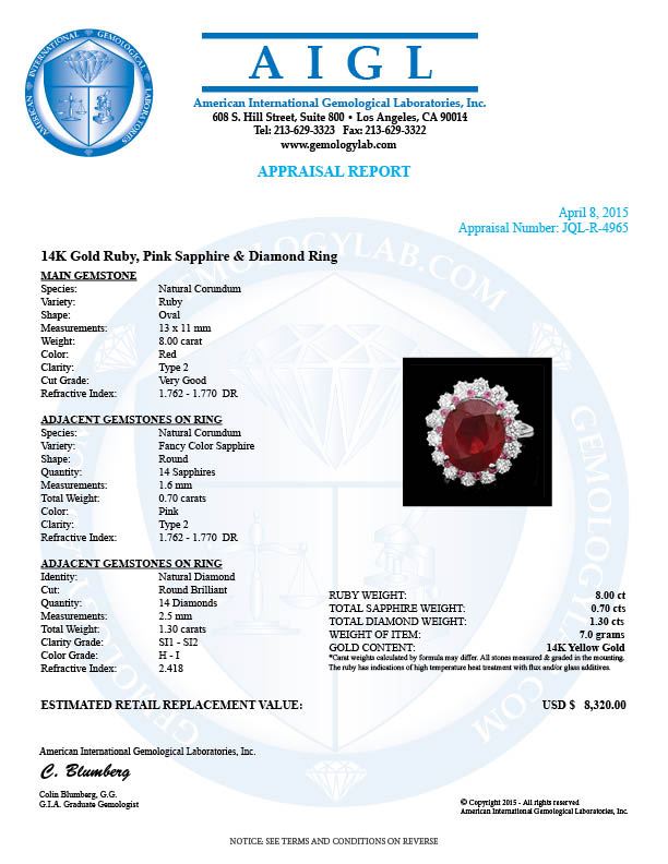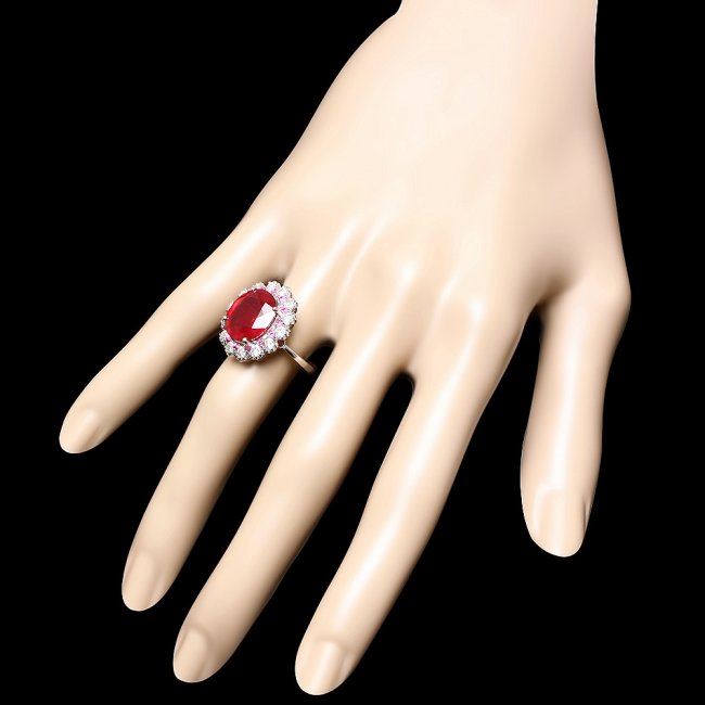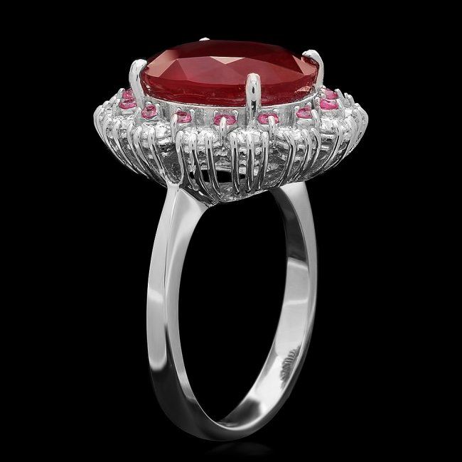 Retail: $8,200.00 ****** 14k White Gold 8.00ct Ruby 1.30ct Diamond Ring ****** Metal: 14k Solid White Gold / Size: 7.5 / Total Item Weight: 6.5 grams / Country Made: United States / / Main Stone: Ruby / Color: Red / Carat Total Weight: 8.00 / Treatment: Filling / Clarity: Type 2 / Cut: Very Good / / Secondary Stone: Diamond / Carat Total Weight: 1.30 / Treatment: None / Color Grade: H - I / Clarity: SI1 - SI2 / Cut: Very Good / / Side Stone: Sapphire / Color: Pink / Carat Total Weight: 0.70 / Treatment: Heating / Clarity: Type 2 / Cut: Very Good /