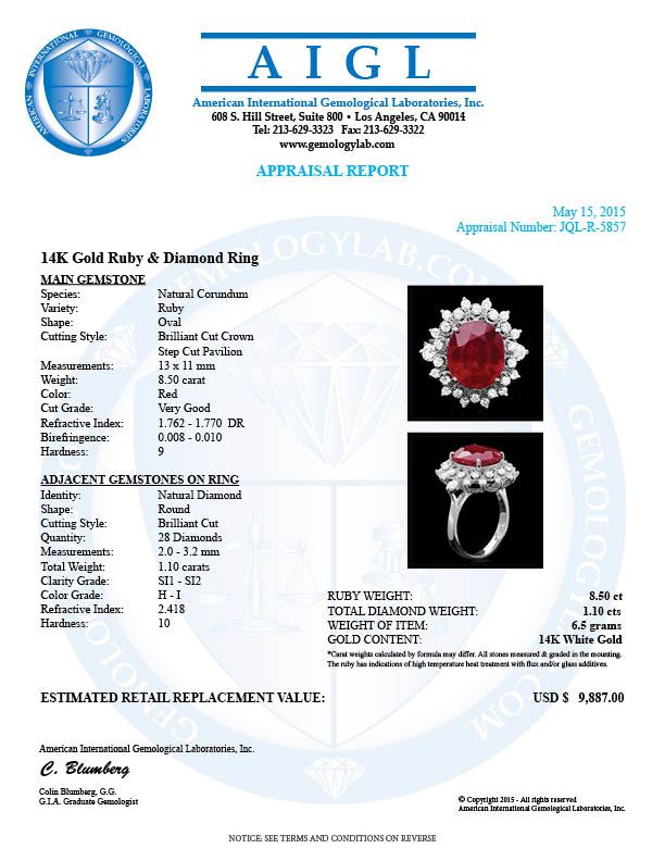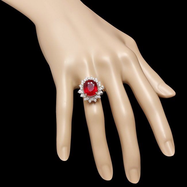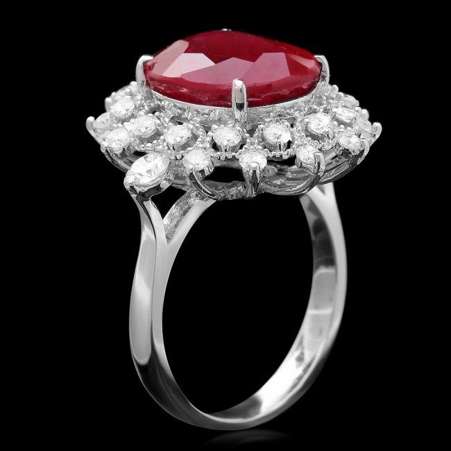 Retail: $9,800.00 ****** 14k White Gold 8.50ct Ruby 1.10ct Diamond Ring ****** Metal: 14k Solid White Gold / Size: 7 / Total Item Weight: 6.5 grams / Country Made: United States / / Main Stone: Ruby / Color: Red / Carat Total Weight: 8.50 / Treatment: Filling / Clarity: Type 2 / Cut: Very Good / / Secondary Stone: Diamond / Carat Total Weight: 1.10 / Treatment: None / Color Grade: H - I / Clarity: SI1 - SI2 / Cut: Very Good /