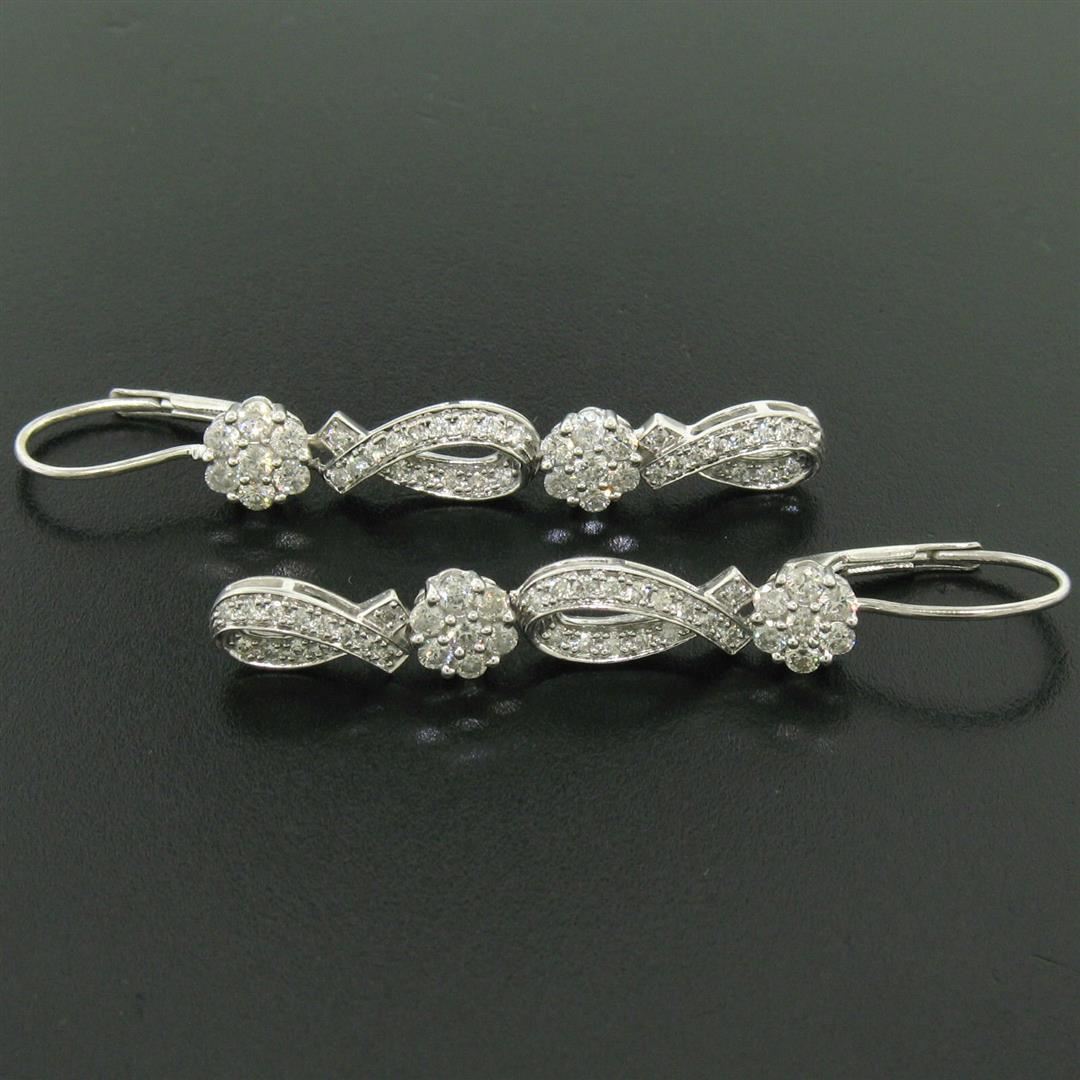 This beautiful pair of ribbon and flower dangle earrings is crafted in solid 14k white gold and features 88 round brilliant cut diamonds. Each earring contains 44 diamonds and has a simple, alternating, ribbon and flower cluster design. The pattern starts with a 7 prong set diamond flower cluster at the top and a 15 pavé set diamond ribbon below it. Each earring is completed with one more flower cluster and one more ribbon. The 88 diamonds in this piece are fine quality, total approximately 1.50 carats in weight, and show a wonderful amount of fire and brilliance. Enjoy!