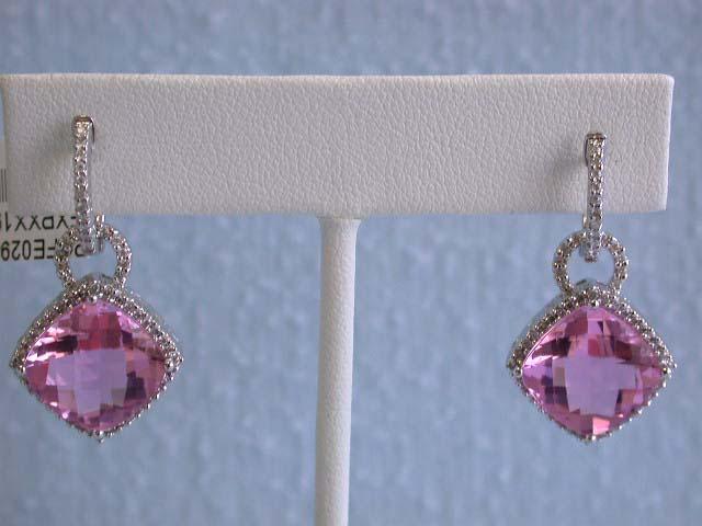 These are E.F.J. Ladies' Fashion Dangling Earrings with Pink Quartz - 13.60 carats and Diamonds - 0.51 carat. The earrings measure approximately 1.25 inches long and weighs 11.2 grams.