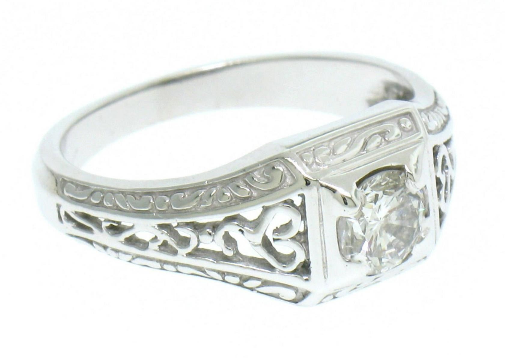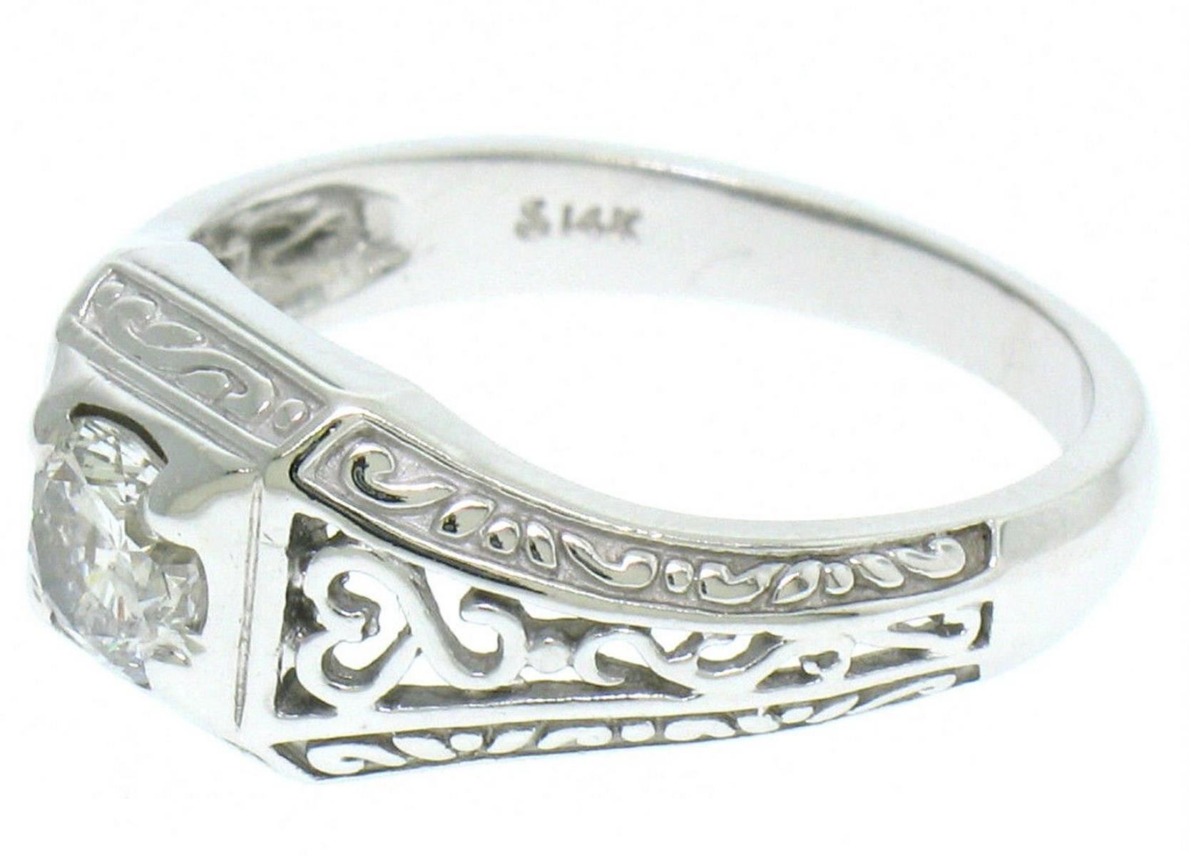 One Estate 14k White Gold Unique Etched Open Work Heart .51ct Diamond Solitaire Ring. Item Details: Material: Solid 14k White Gold, Weight: 3.8 Grams, Stone(s): (1) Natural Genuine Diamond - Round Brilliant Cut - Prong Set - I Color - SI1 Clarity, Total Carat Weight: 0.51 (approx.), Ring Size: 6.0 (We can custom size this ring.), Ring Width: 8.0mm, Condition: Estate piece in like new condition!