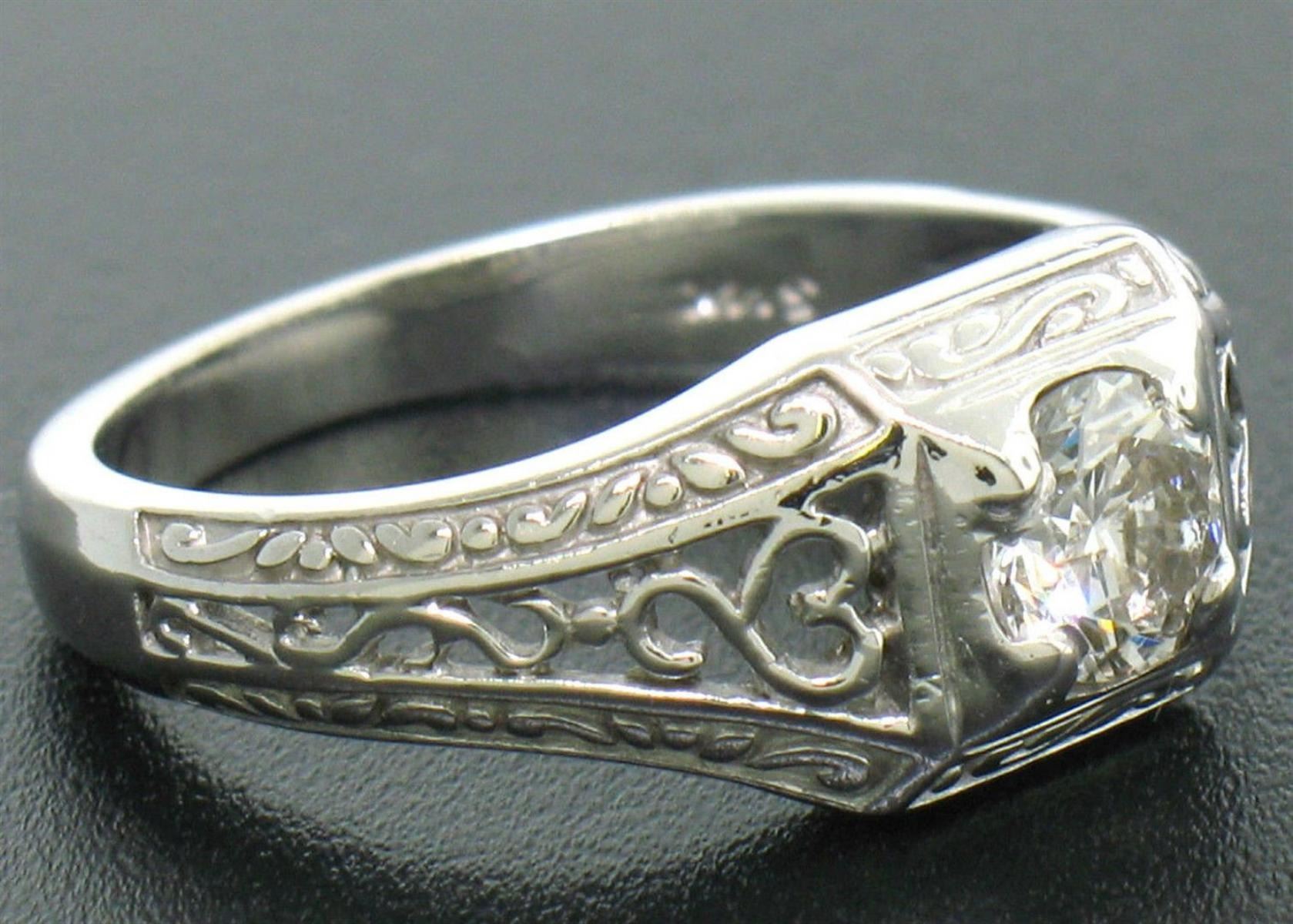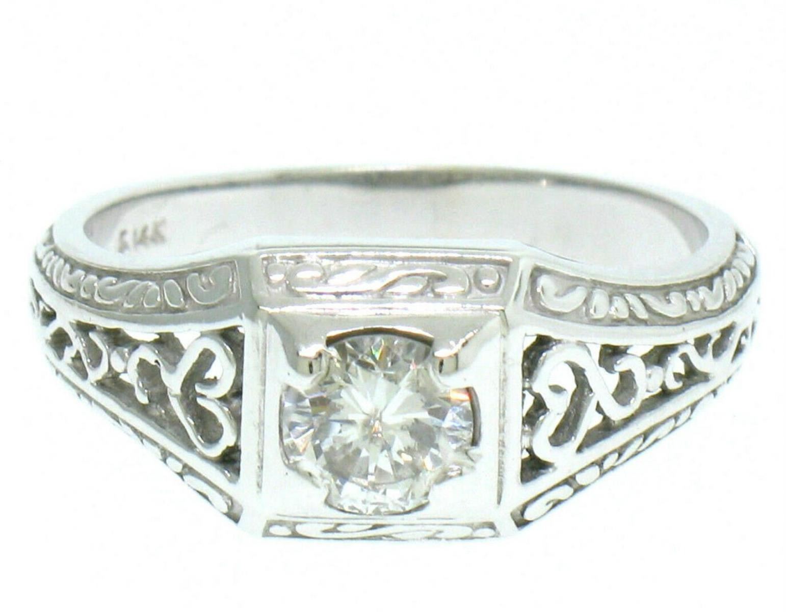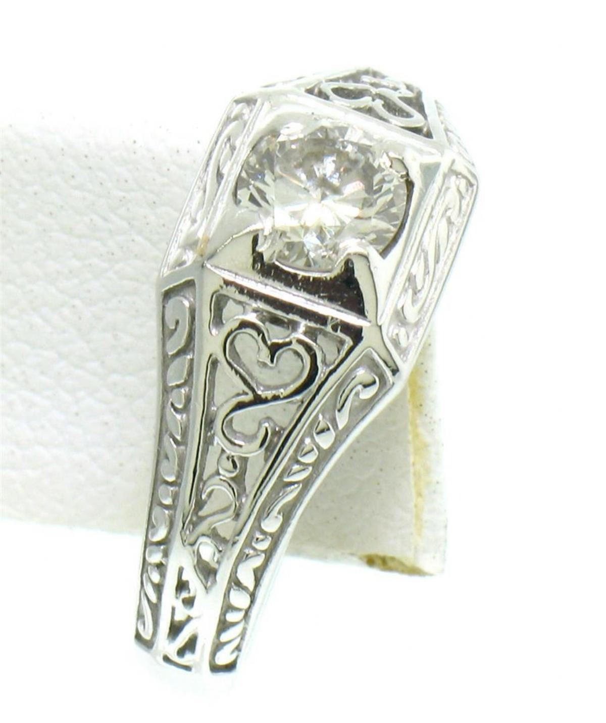 One Estate 14k White Gold Unique Etched Open Work Heart .51ct Diamond Solitaire Ring. Item Details: Material: Solid 14k White Gold, Weight: 3.8 Grams, Stone(s): (1) Natural Genuine Diamond - Round Brilliant Cut - Prong Set - I Color - SI1 Clarity, Total Carat Weight: 0.51 (approx.), Ring Size: 6.0 (We can custom size this ring.), Ring Width: 8.0mm, Condition: Estate piece in like new condition!