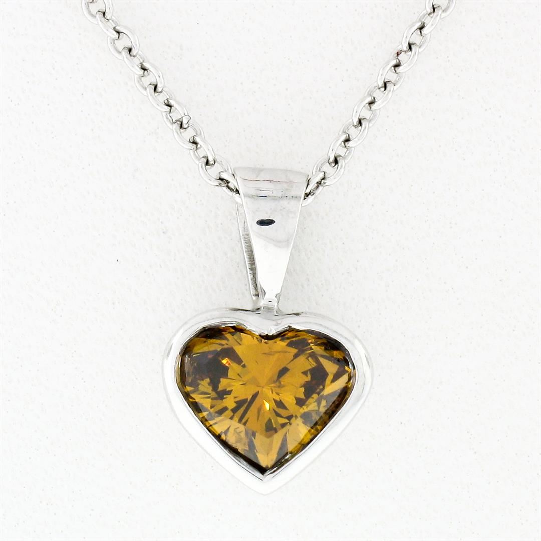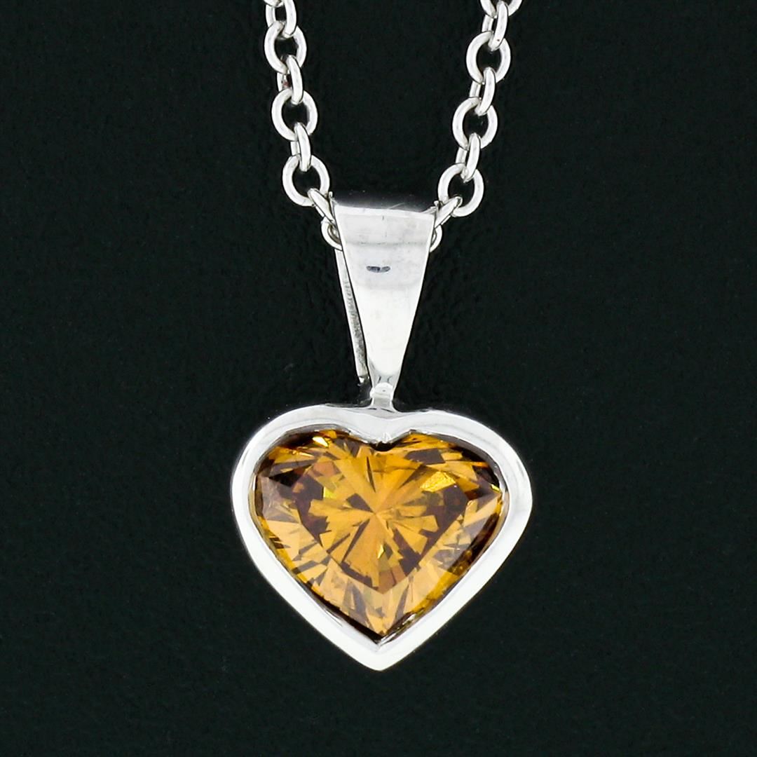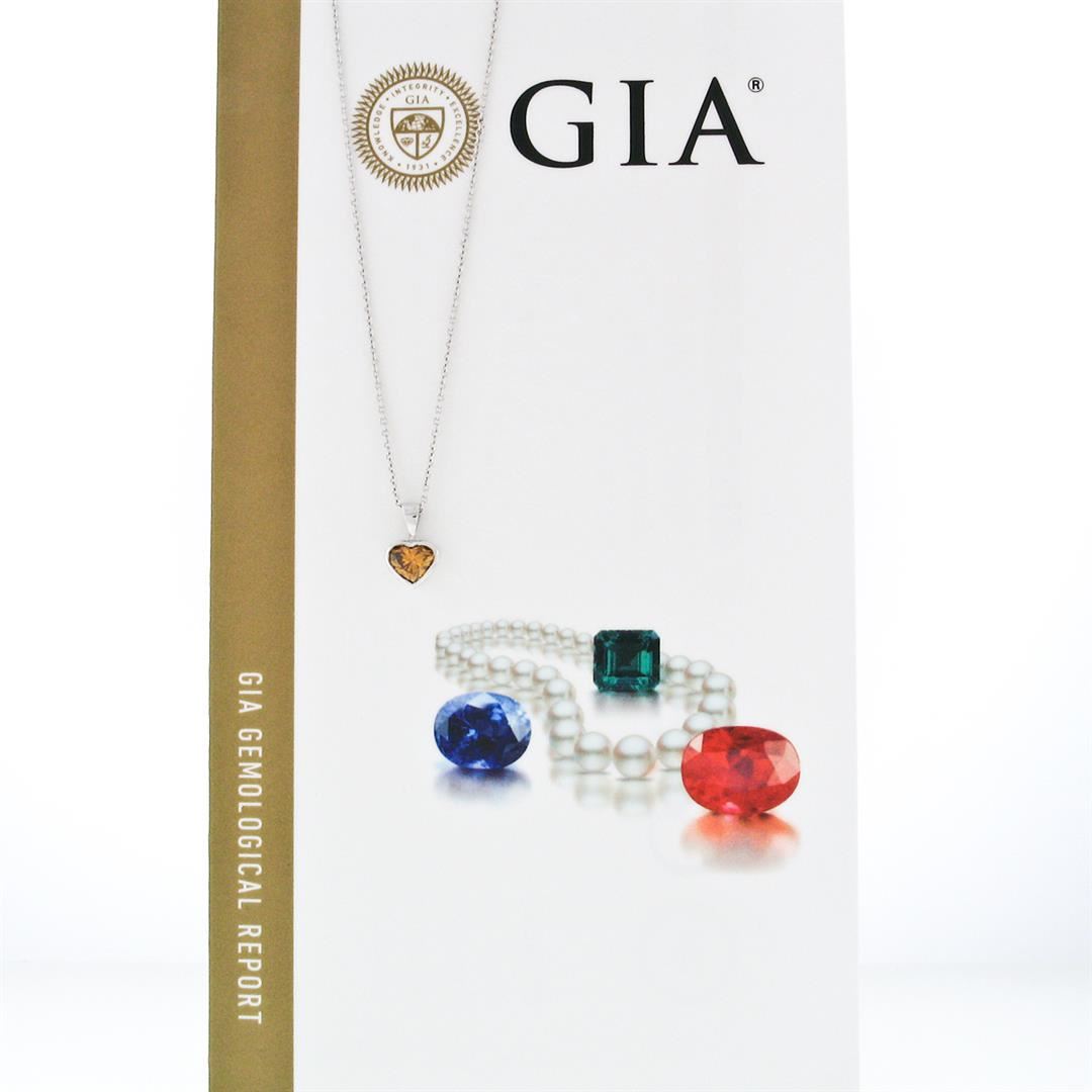An estate solid 14k white gold heart pendant necklace, with 1 Gia certified heart brilliant cut natural diamond (fancy deep brown-orange color - I1 ; 0.70ct). The pendant weighs a total of 3.0 grams, measures 12.3x7.9mm including the bail, and 18 inch cable link chain. Comes with all original relevant certifications.
