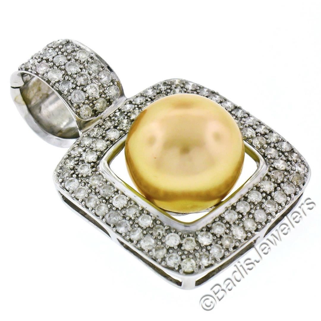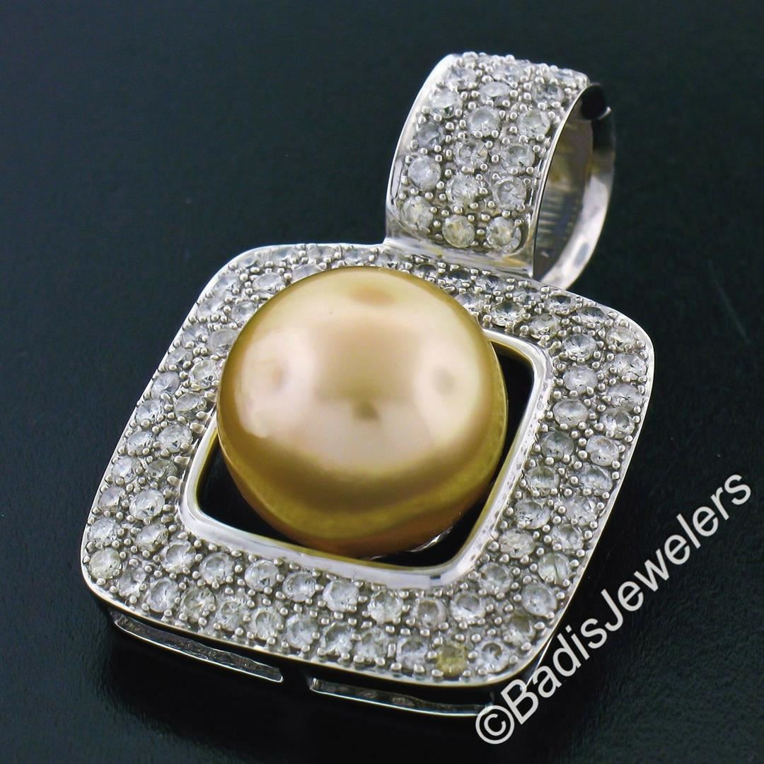 A like new 14kt white gold enhancer pendant featuring a 14.4mm round cultured pearl surrounded by 3.0ctw of round diamonds (G/H - SI2/I1). The pendant weighs a total of 13.34 grams, measures 39.5x25.6mm, and the inside of the bail measures 11.0x10.6mm.