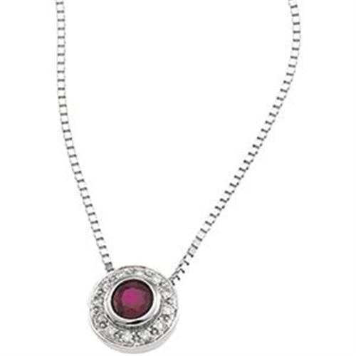 14k White Gold Necklace featuring a center RUBY = .25 Carats encirlced by Diamonds. The Pendant is set into a 14k White Gold Neck Chain 18" in length.