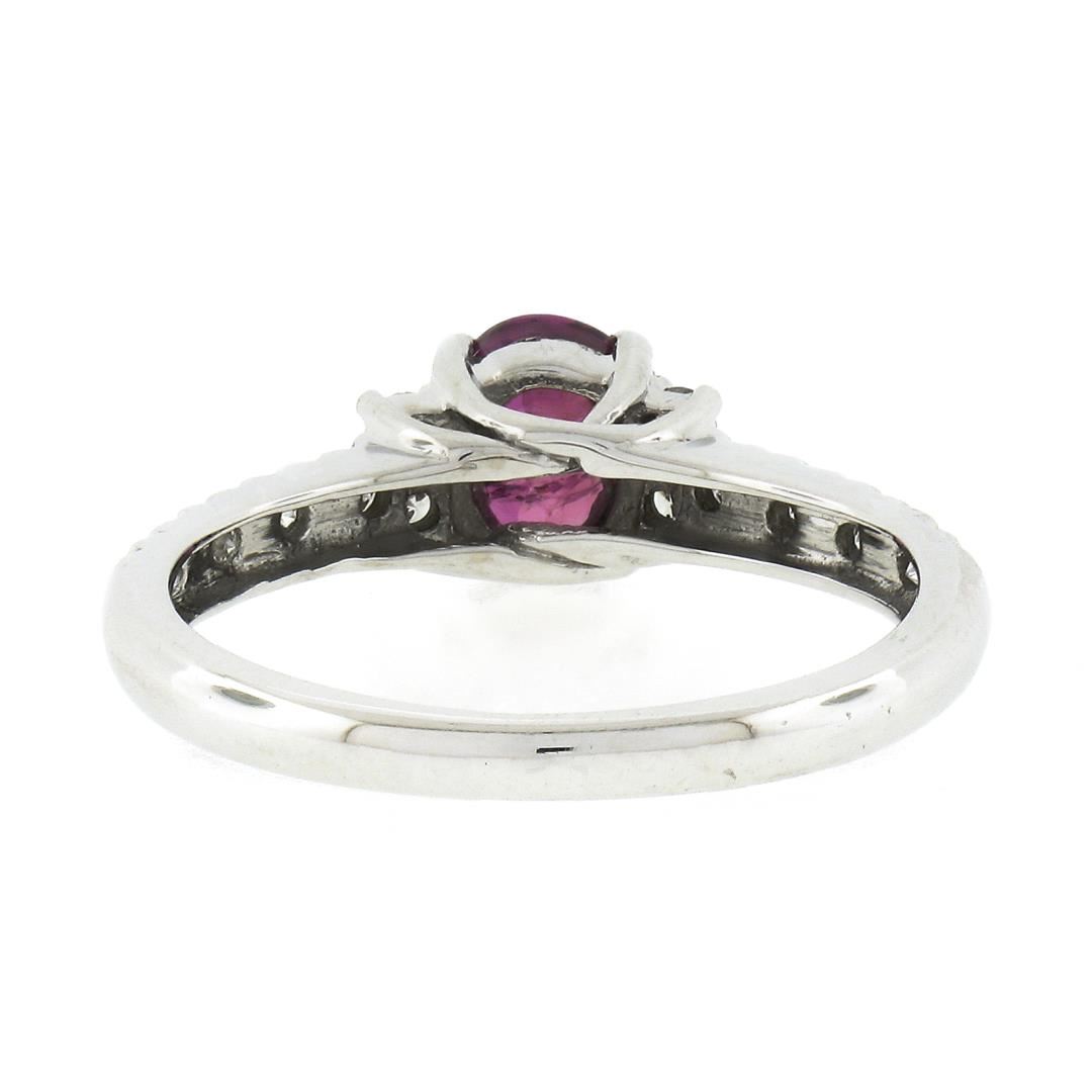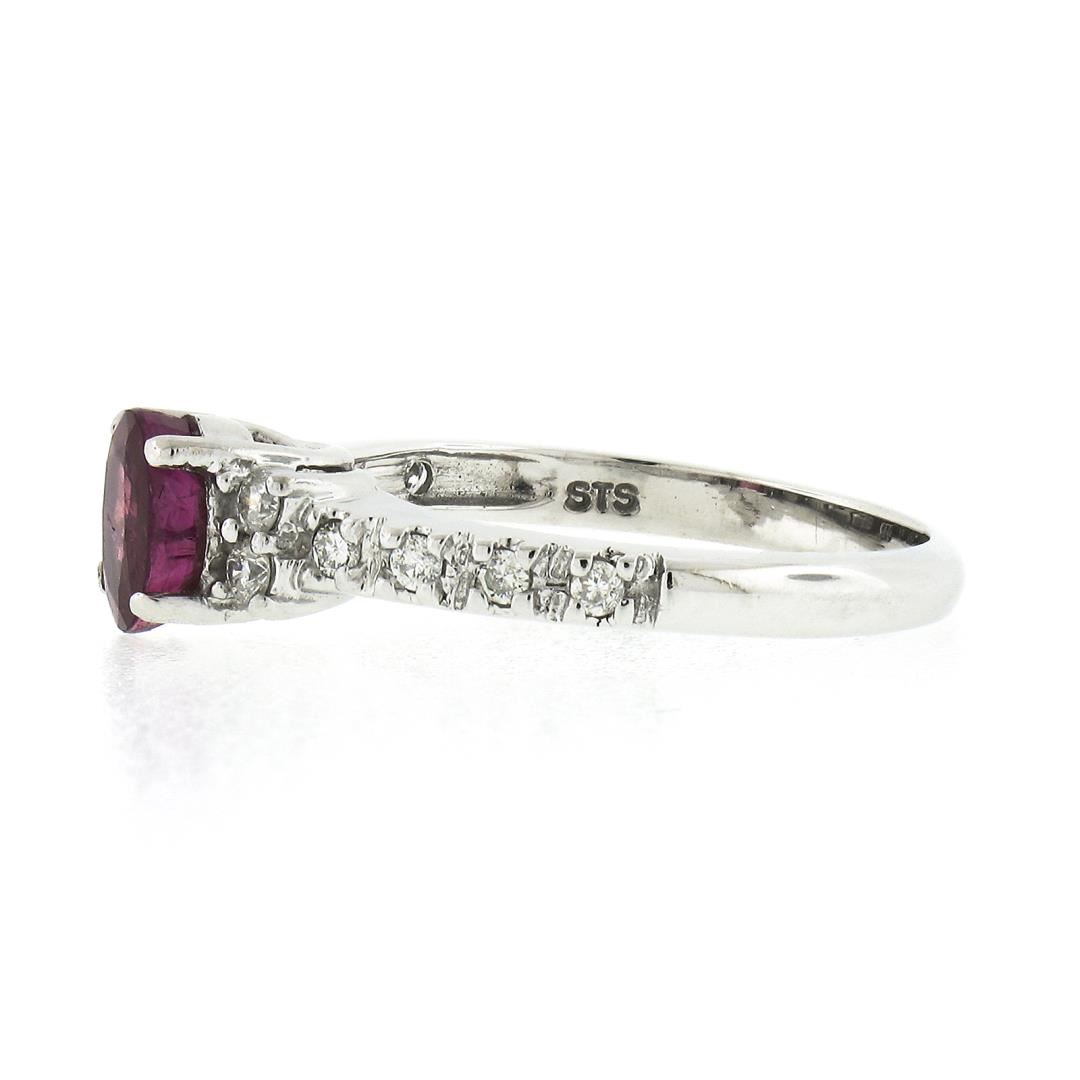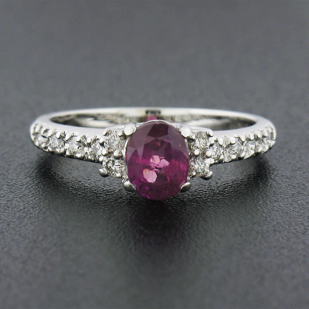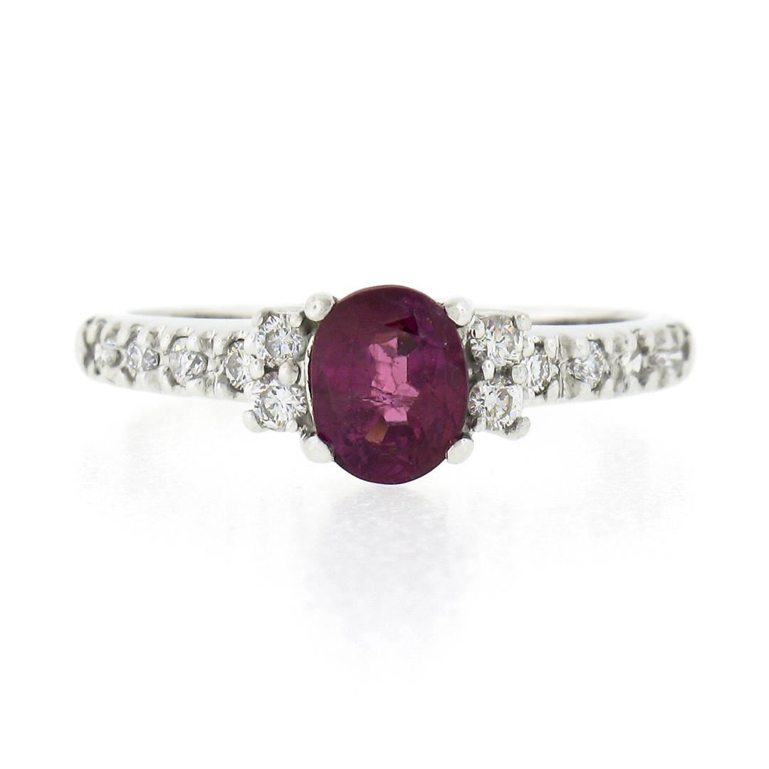 A solid 14k white gold ring, featuring 1 oval cut natural spinel (4.59x5.87), and 12 round brilliant cut natural diamonds (G/H - SI1/SI2 ; 0.20ctw). The ring is size 5.0, weighs a total of 2.30 grams, and measures 5.85mm wide.