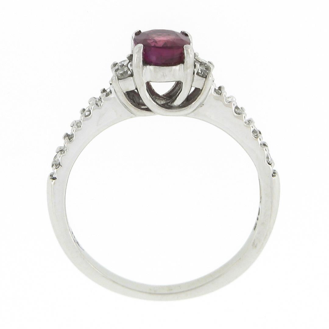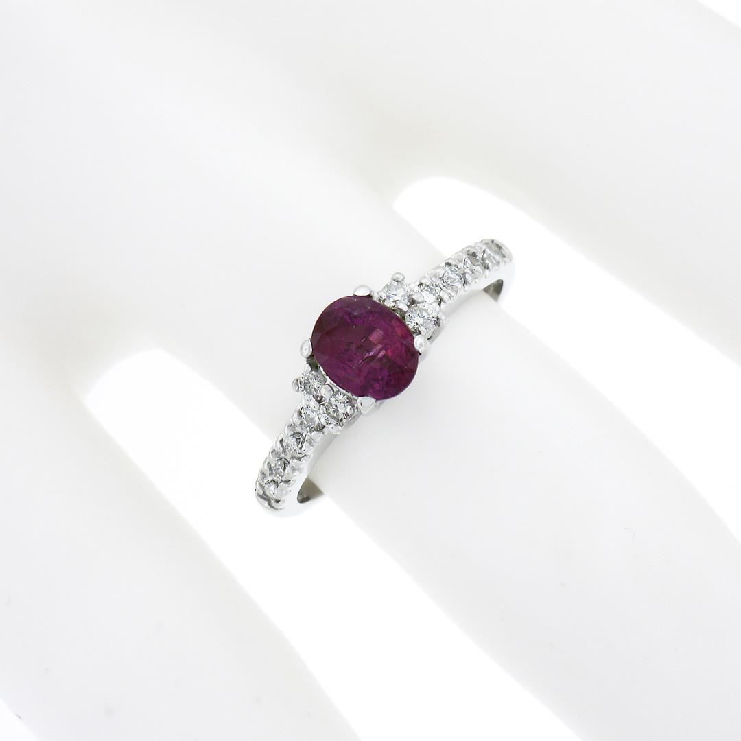 A solid 14k white gold ring, featuring 1 oval cut natural spinel (4.59x5.87), and 12 round brilliant cut natural diamonds (G/H - SI1/SI2 ; 0.20ctw). The ring is size 5.0, weighs a total of 2.30 grams, and measures 5.85mm wide.