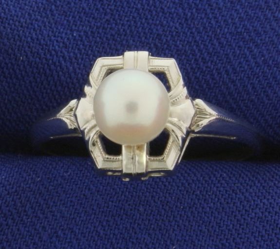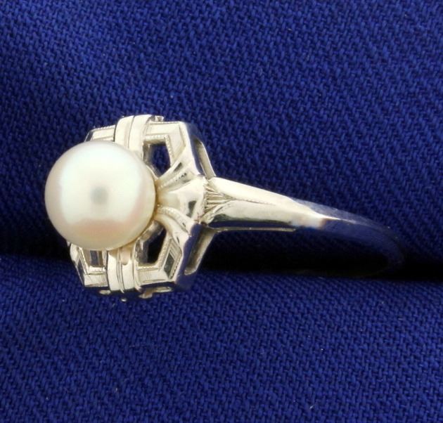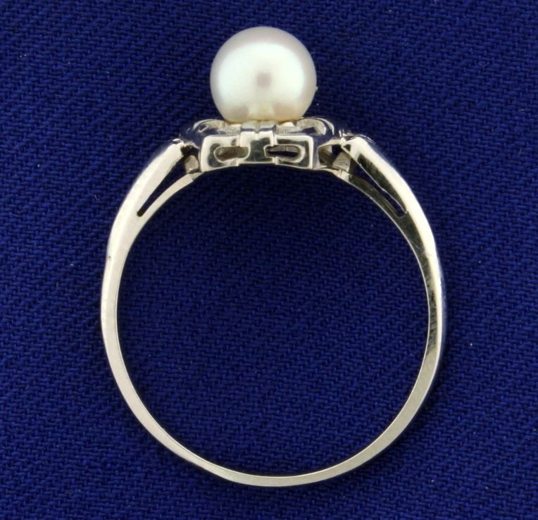 In 14k white gold. Contains a high quality 6mm cultured pearl with excellent color and luster. Size 8 1/2. 2.3g.