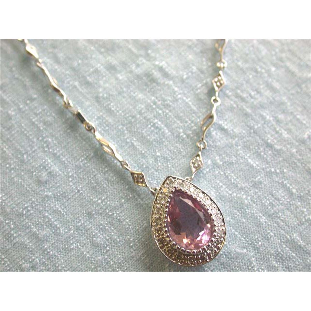 14k White Gold Necklace w/ Diamonds - 0.23 carats, round cut, G color and VS clarity (pave round setting) and Pink Glass - 1.85 carats. Length - 15.5 inches long and Weight - 9.1 grams