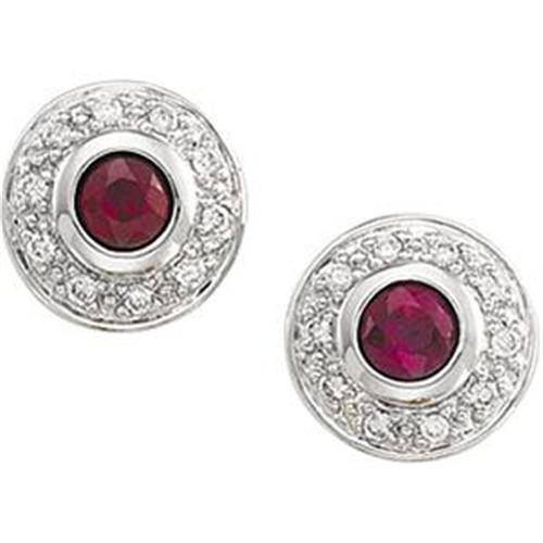 14k White Gold Ruby and Diamond Earstuds. Each Earring features a center RUBY encircled by Diamonds. The Earrings have post style backs for pierced ears.