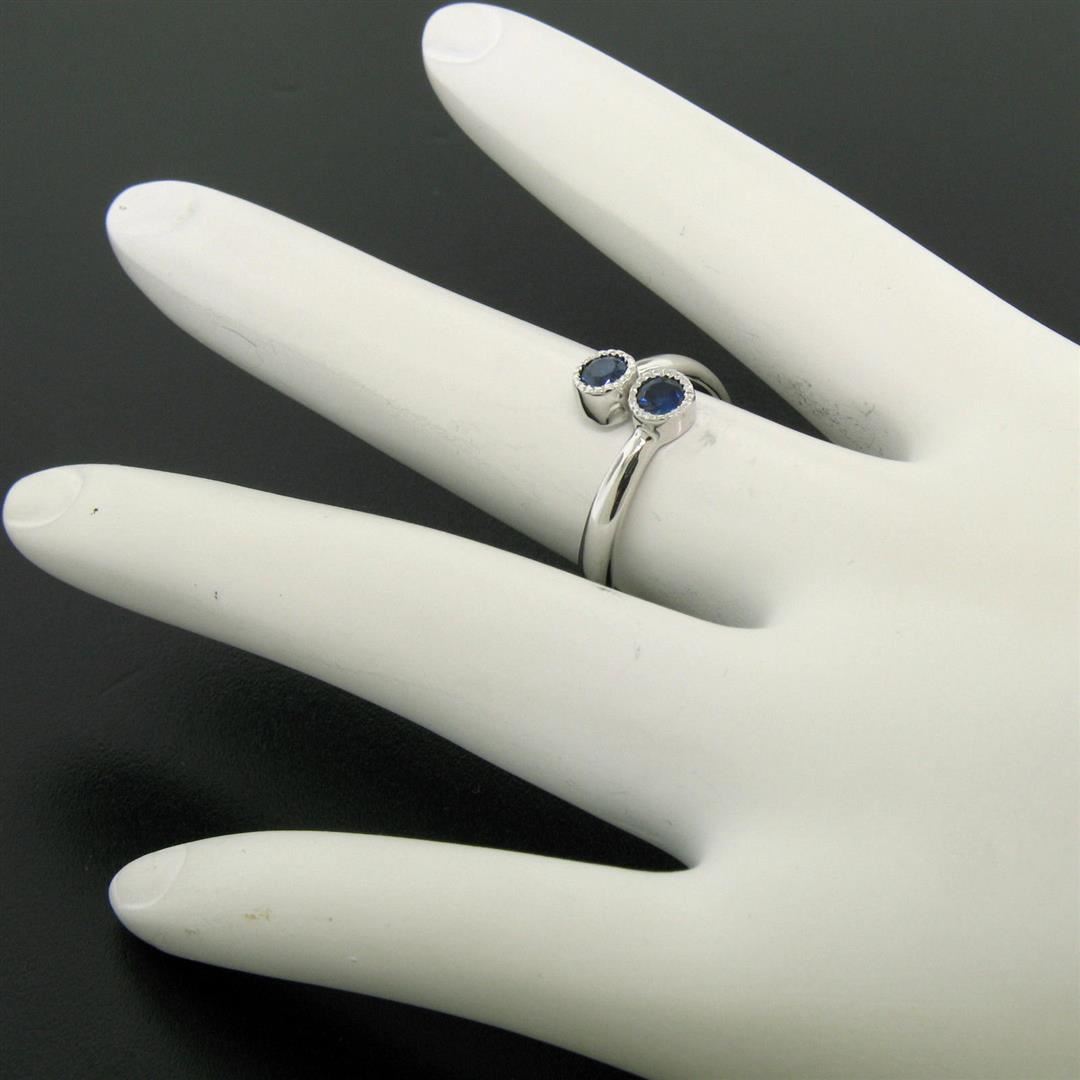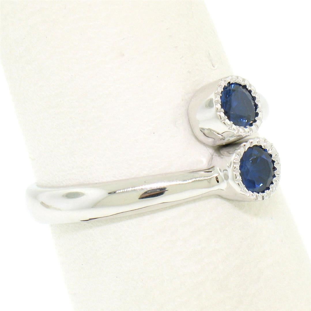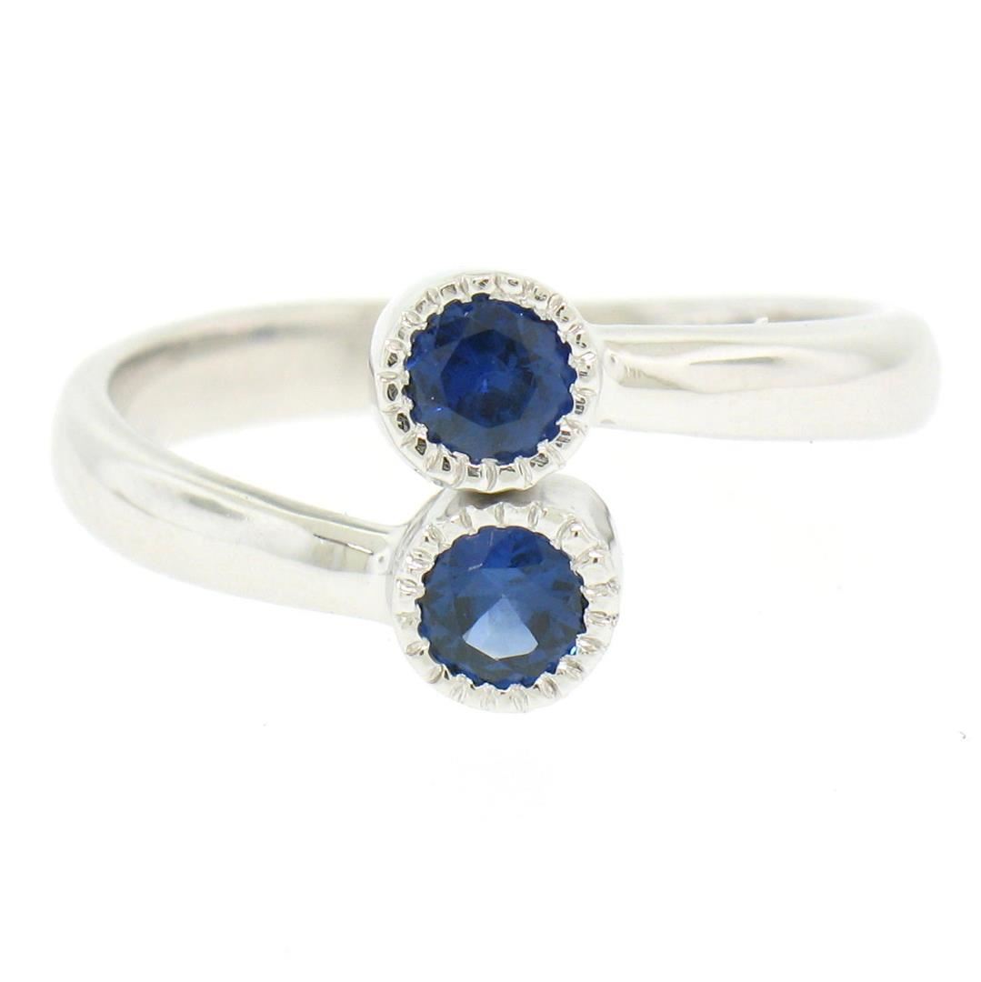 This brand new custom made piece is a simple gold and sapphire bypass ring. The ring is crafted in solid 14k white gold and features 2 bezel set round cut sapphires in a bypass design. The bezels are embellished with a simple milgrain-style etching. The sapphires total exactly 0.41 carats in weight and are a vibrant and rich royal blue color. A simple, two stone, sapphire bypass ring. Enjoy!