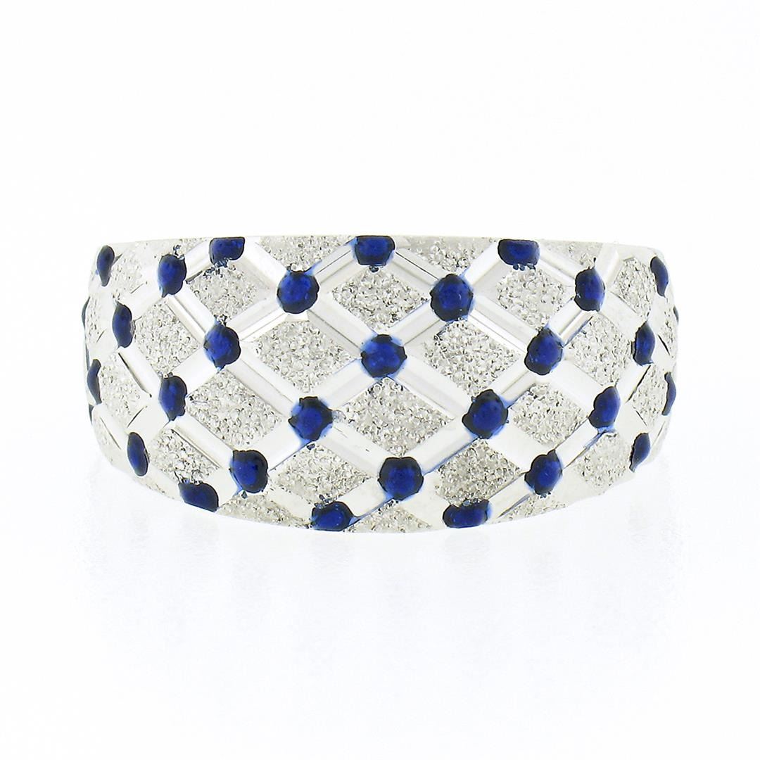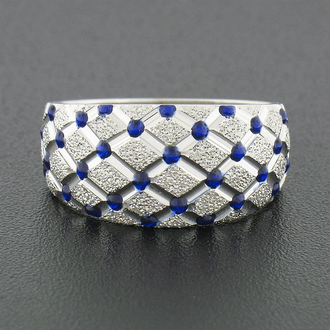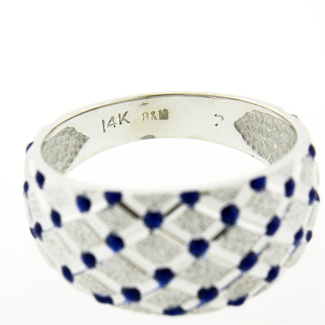 14k White Gold Royal Blue Enamel Dot Tufted Grid w/ Dual Finish Wide Band Ring