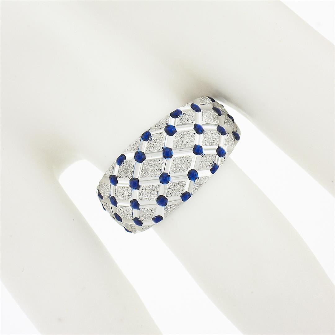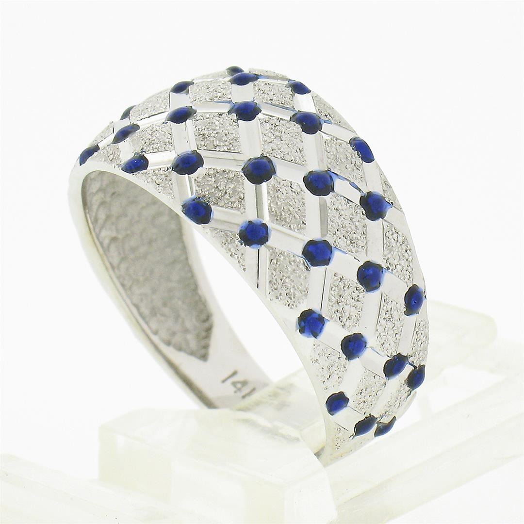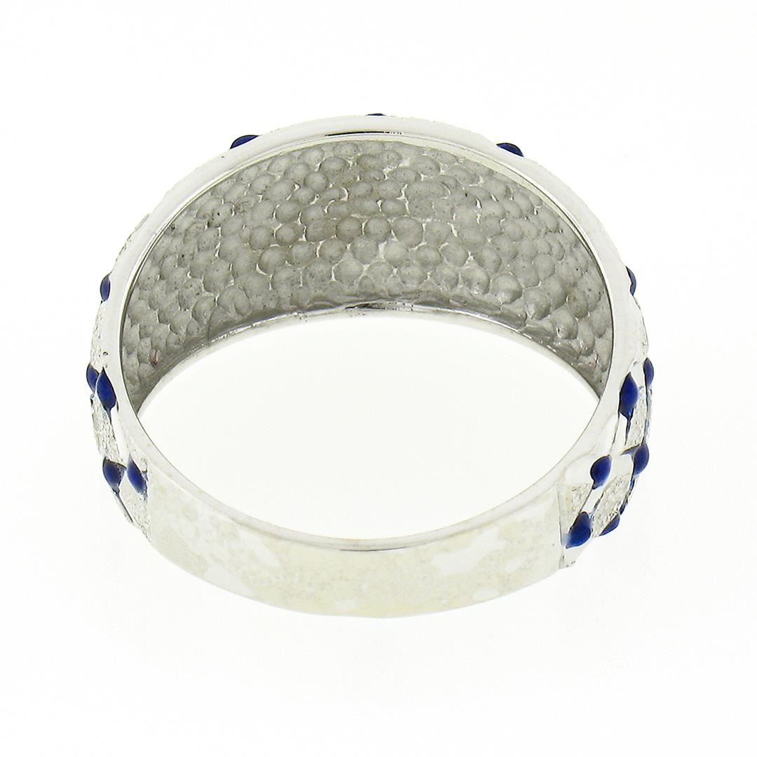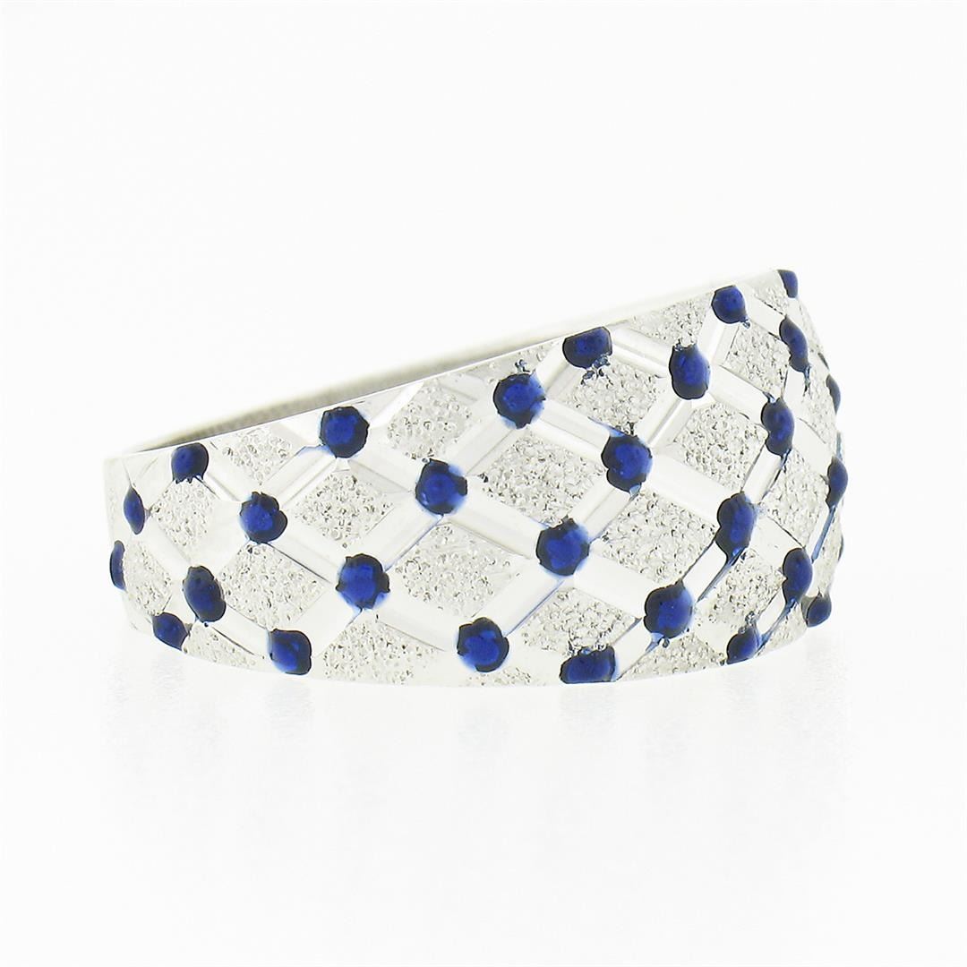 14k White Gold Royal Blue Enamel Dot Tufted Grid w/ Dual Finish Wide Band Ring