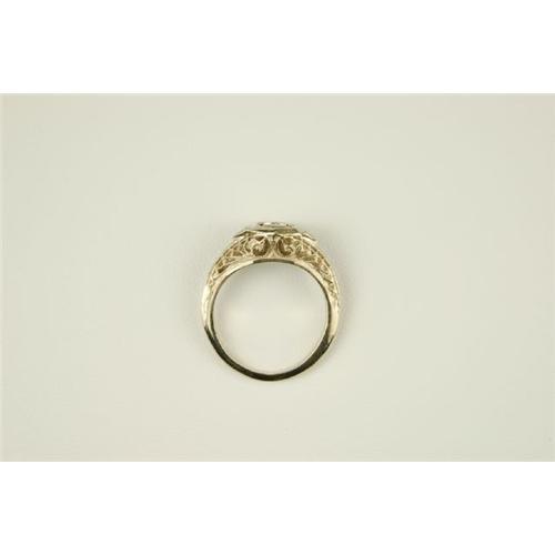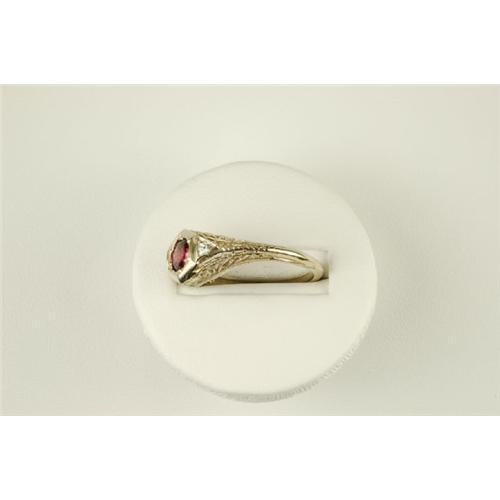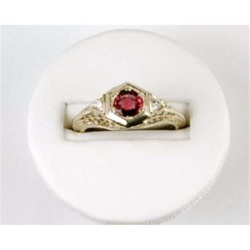 Antique 14k White Gold filigree ring with a Genuine Ruby = .45 CARATS! This ring is often worn as an 'Antique Ruby and Diamond Engagement ring'. There is a Diamond each side. The Diamond Total Weight = .06 Carats. This ring is a size 6 3/4 and I can easily resize it for you. It IS in Mint condition.
