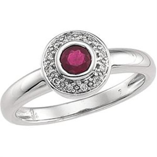 14k White Gold ring featuring a center RUBY = .25 Carats encircled by Diamonds. This beautiful ring is a Size 6 and I can easily resize it for you.