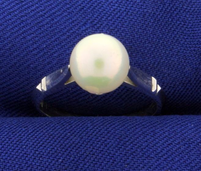 In 14k white gold. Contains a high quality 7.75mm cultured pearl with excellent color and luster. Size 5 3/4. 2.4g.