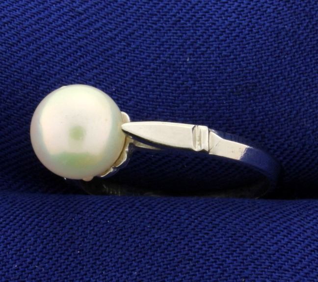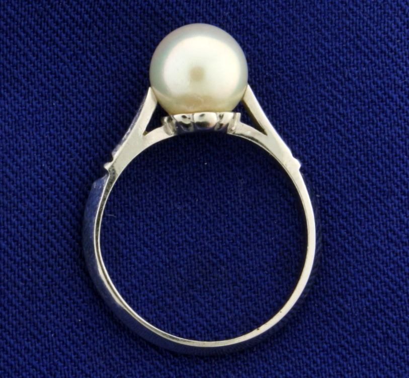 In 14k white gold. Contains a high quality 7.75mm cultured pearl with excellent color and luster. Size 5 3/4. 2.4g.